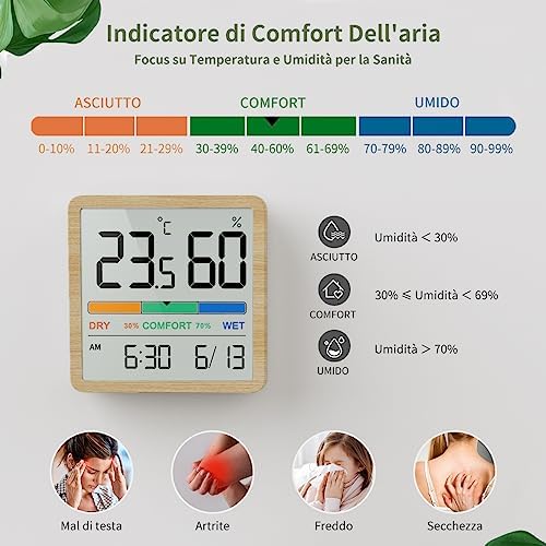 【 Reazione rapida e alta precisione】 Con risposta rapida aggiornata ogni 10 secondi e fornisce misurazioni precise, ampio campo di misurazione che misura la temperatura: -9,9 °C – 60 °C (14,2 °F – 140 °F), precisione della temperatura: ± 1 °C. Misura umidità umidità: 10% RH ~ 95% RH, precisione di umidità: ± 3%.