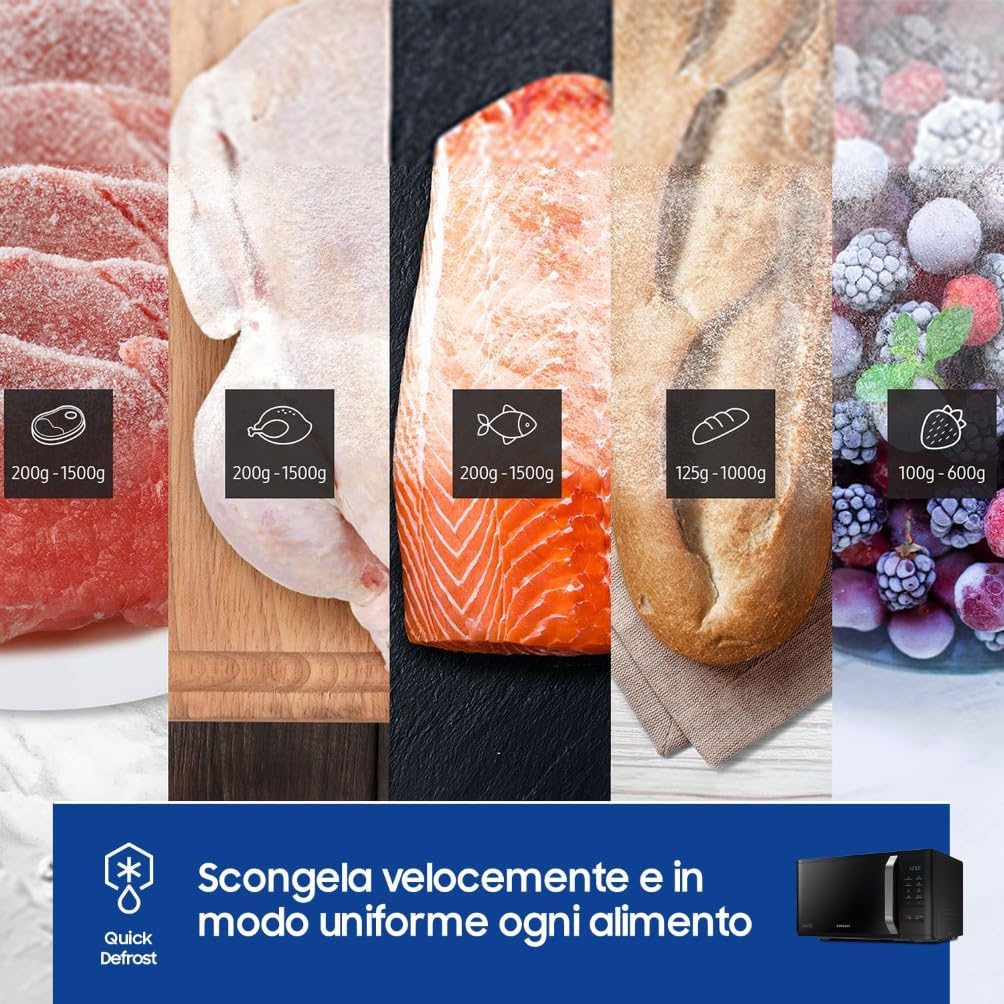 Cucina cibi deliziosi e sani, con un microonde dallo stile inconfondibile! Il forno a microonde Samsung cuoce e griglia facilmente cibi sia freschi che surgelati grazie ai programmi preimpostati per la cottura e lo scongelamento automatico. Inoltre puoi cucinare deliziosi dessert con un tocco grazie ai programmi preimpostati della funzione Home dessert. Il Grill in metallo è più resistente di uno al quarzo e più facile da pulire.