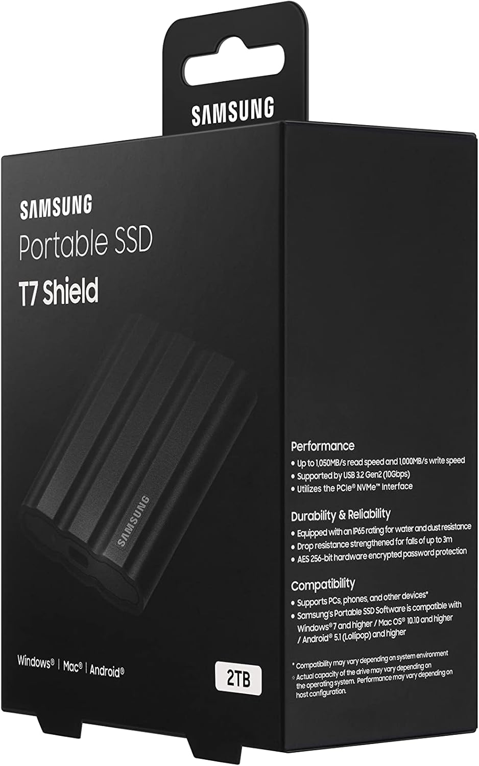 Contents: 1 x SAMSUNG PSSD T7 Shield (MU-PE2T0S/EU) 2TB USB 3.2 Gen 2 (up to 10Gbps), backwards compatible. Cables included in package: USB Type C-C, USB Type C-A