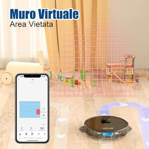 【Navigazione laser】 sistema avanzato di navigazione laser per pianificare in modo intelligente i percorsi di pulizia, può memorizzare fino a 5 mappe di pulizia;