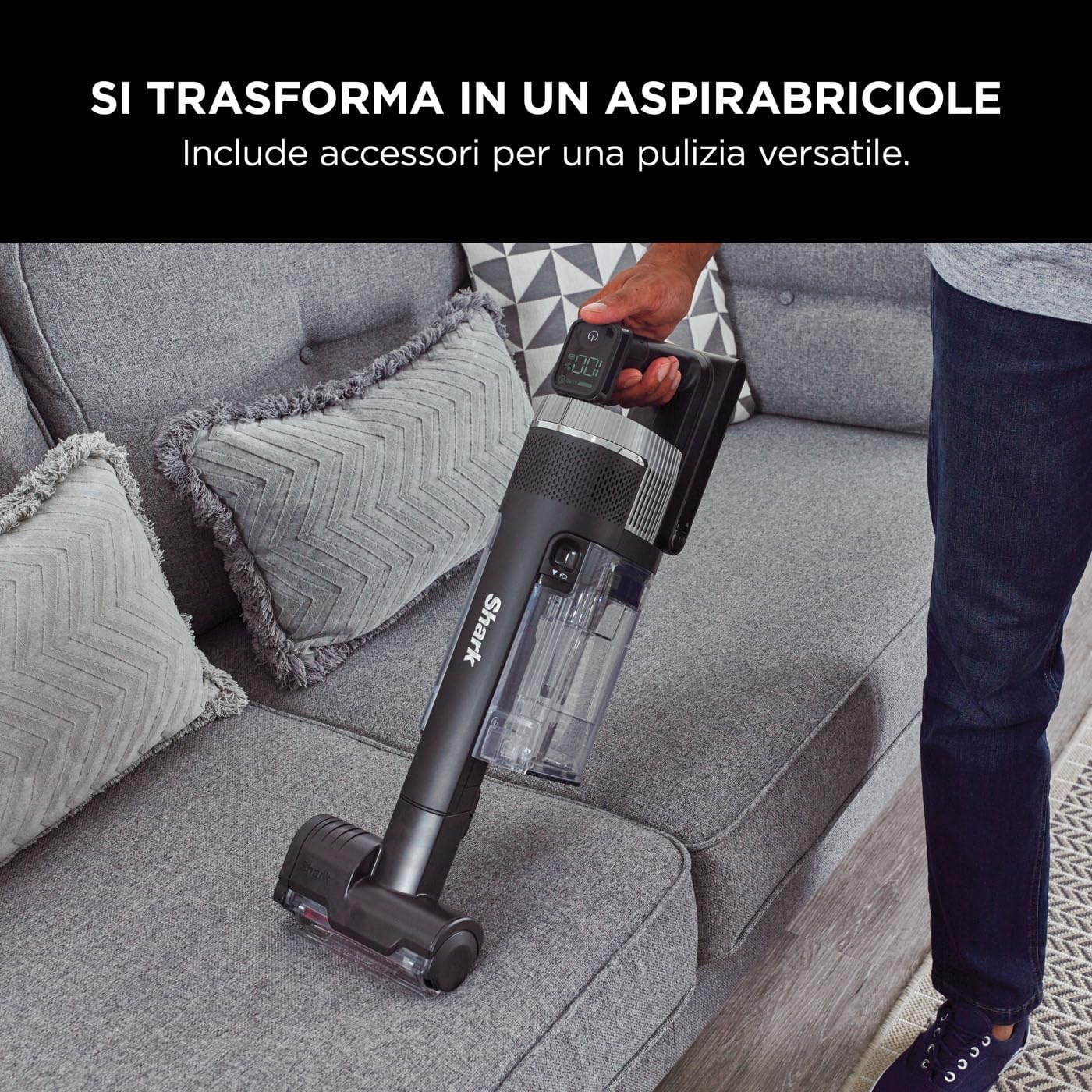 Introducing the revolutionary cordless vacuum cleaner from the Shark Stratos collection. Clean Sense IQ uses special sensors to detect dirt and automatically adjusts suction power to collect up to 50% more dirt*. Reach any space, charge and store anywhere with Flexology, the functionality that allows the unit to fold for you. DuoClean + PowerFins Plus offer the best hair removal capability ever seen in a Shark product. Two brushes work together in a floor brush head to clean all floor types. PowerFins Plus is designed to capture more hair**. Tangle free technology removes hair from the brush as you clean. Enjoy up to 120 minutes of battery life*** and charge removable batteries in the vacuum cleaner or separately, wherever you go. Clean everywhere with only 4 nozzles, including the pet accessory. Anti-Allergen Complete Seal system catches and retains dust and allergens. Shark – Technologies that make a difference. *Compared to Shark IZ400EU in ECO mode. **Compared to Shark bristle brush roller. ***In Eco Power mode, with non-motorized nozzles, using two batteries consecutively.