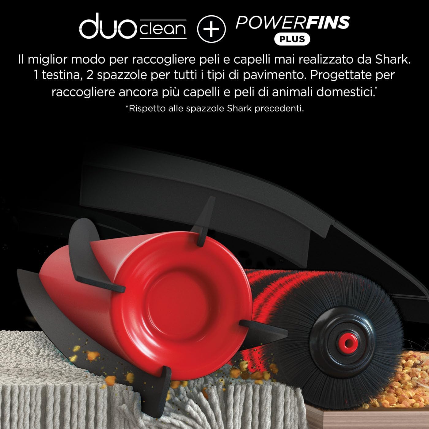 DUOCLEAN + POWERFINS PLUS: Collects hair like no other Shark product. ANTI-TANGLE TECHNOLOGY removes hair from the roller brush while you clean. Effortlessly transitions from carpets to floors
