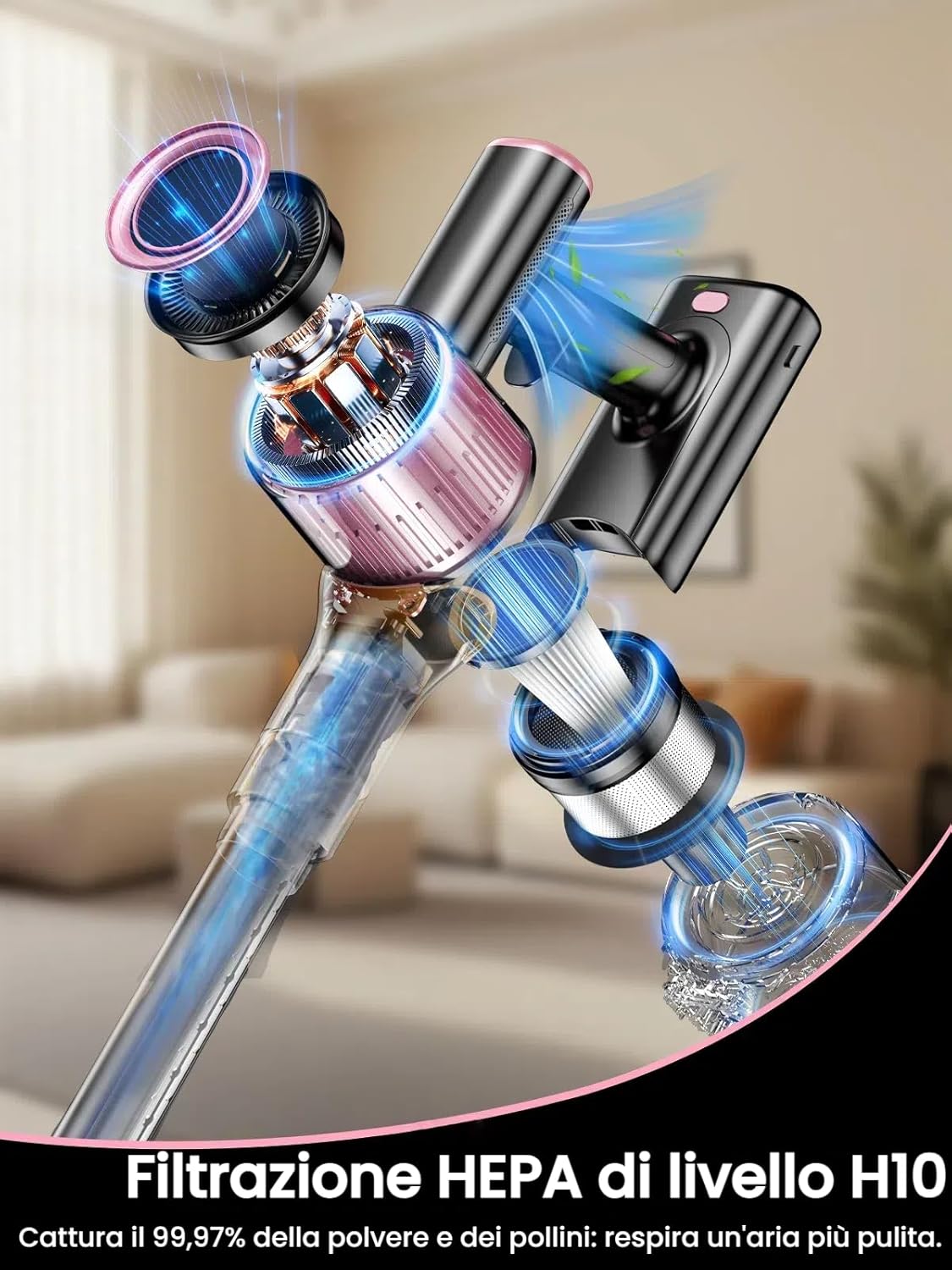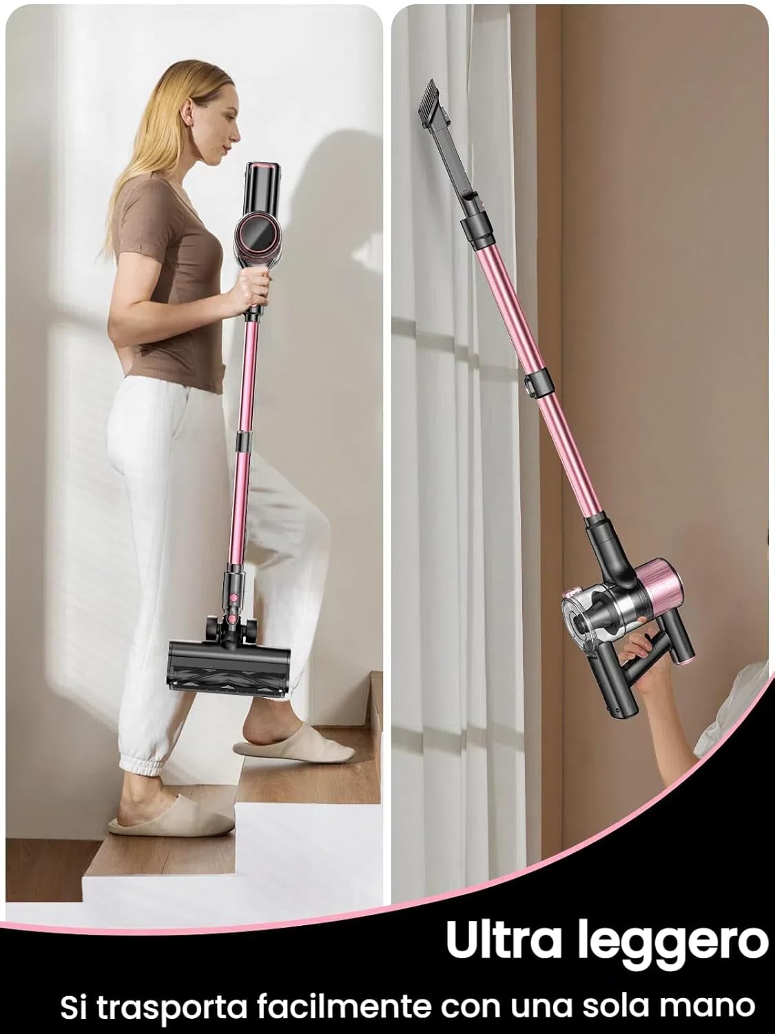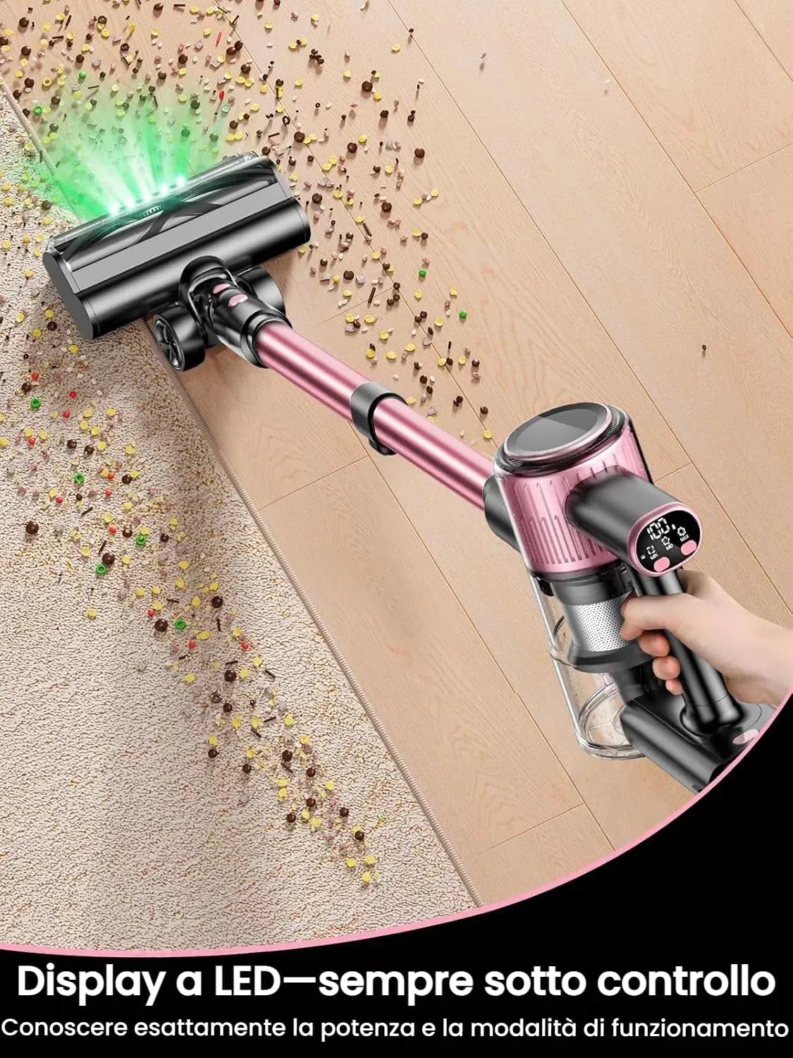 🌀【500W/45KPA ASPIRAZIONE PRO】 Ti stancano peli di animali e angoli pieni di polvere? Con il motore brushless 500W e l’aspirazione ciclonica 45KPa, questo aspirapolvere senza fili elimina briciole, peli e polvere sottile da pavimenti, tappeti, divani e auto! Tre livelli regolabili (Eco/Standard/Turbo) si adattano a ogni scenario: dalla pulizia delicata sui parquet alla potenza turbo per tappeti spessi. Dì addio alle pulizie infinite e goditi una casa impeccabile con un solo click!