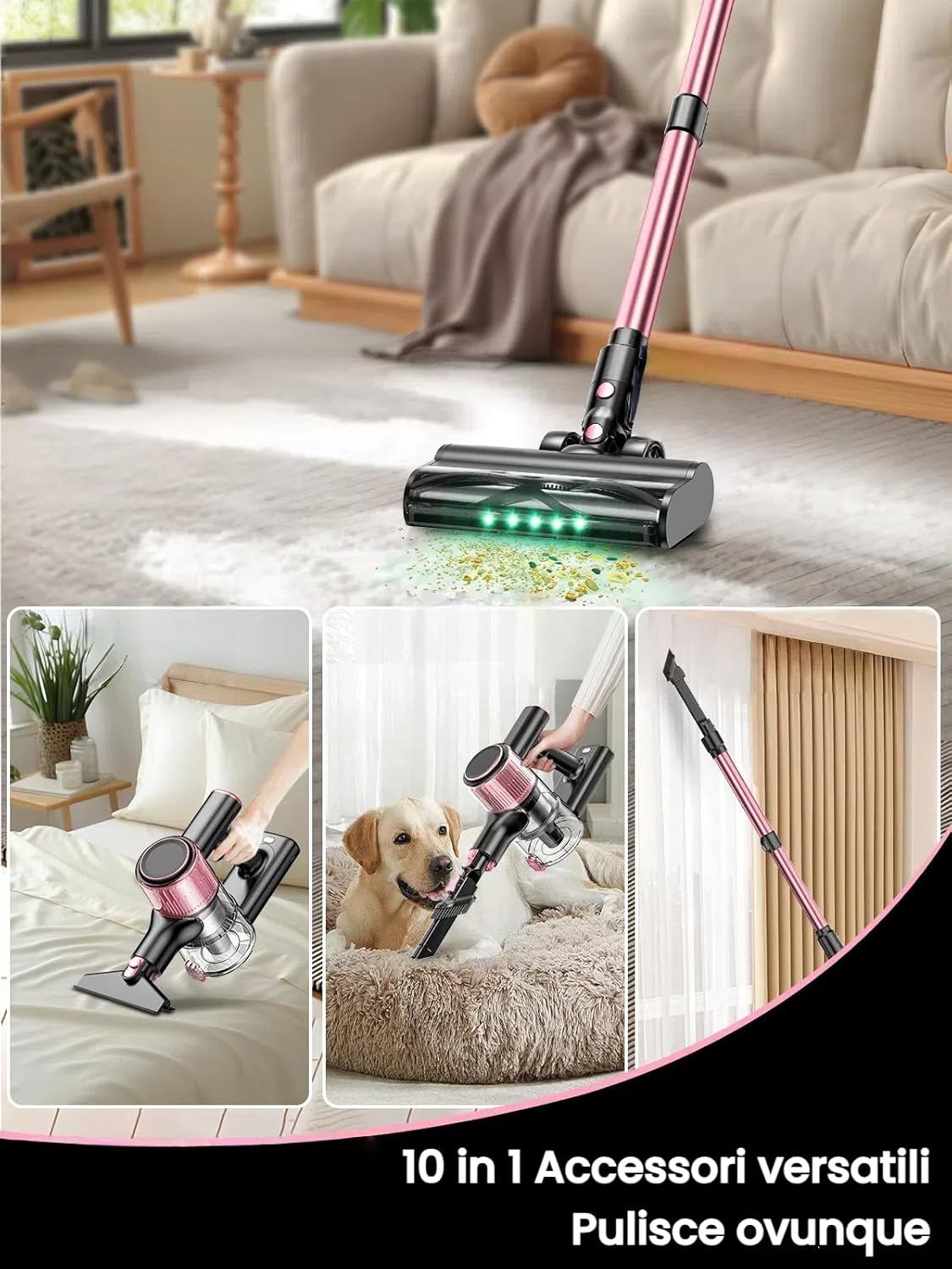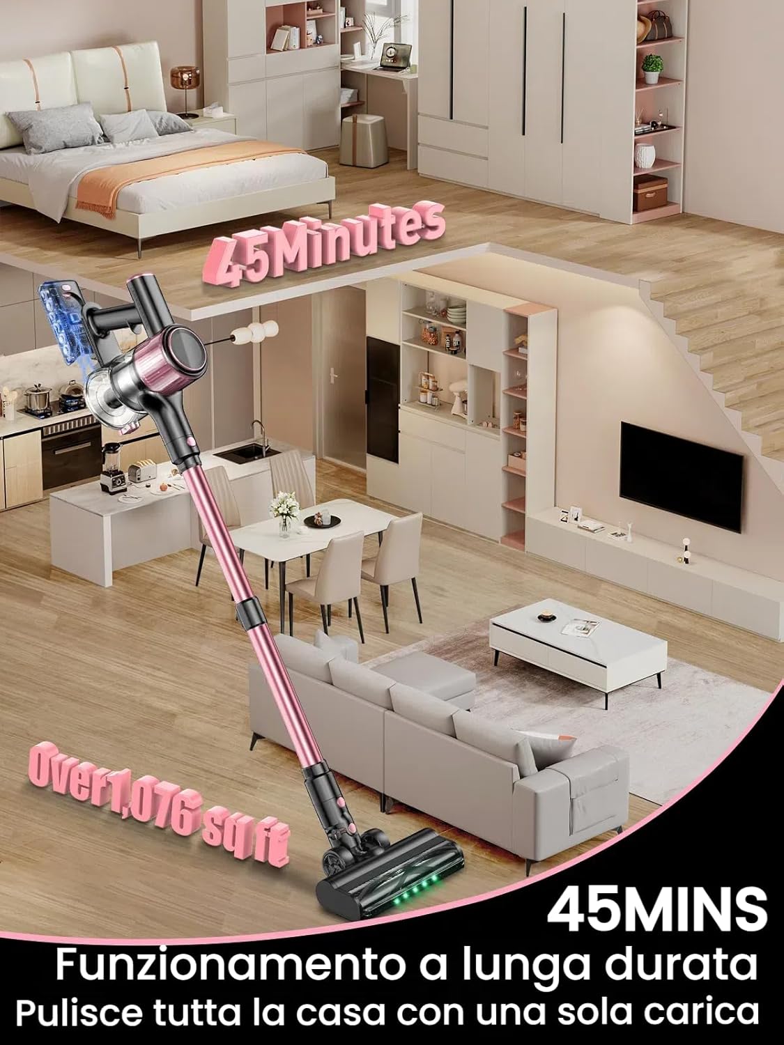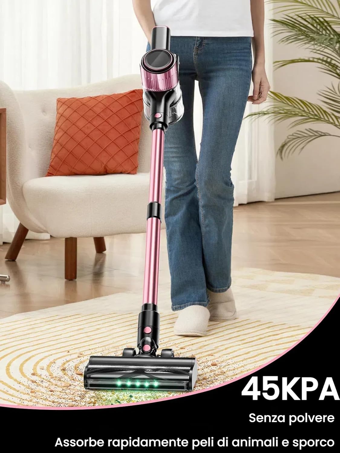 🌀【500W/45KPA ASPIRAZIONE PRO】 Ti stancano peli di animali e angoli pieni di polvere? Con il motore brushless 500W e l’aspirazione ciclonica 45KPa, questo aspirapolvere senza fili elimina briciole, peli e polvere sottile da pavimenti, tappeti, divani e auto! Tre livelli regolabili (Eco/Standard/Turbo) si adattano a ogni scenario: dalla pulizia delicata sui parquet alla potenza turbo per tappeti spessi. Dì addio alle pulizie infinite e goditi una casa impeccabile con un solo click!