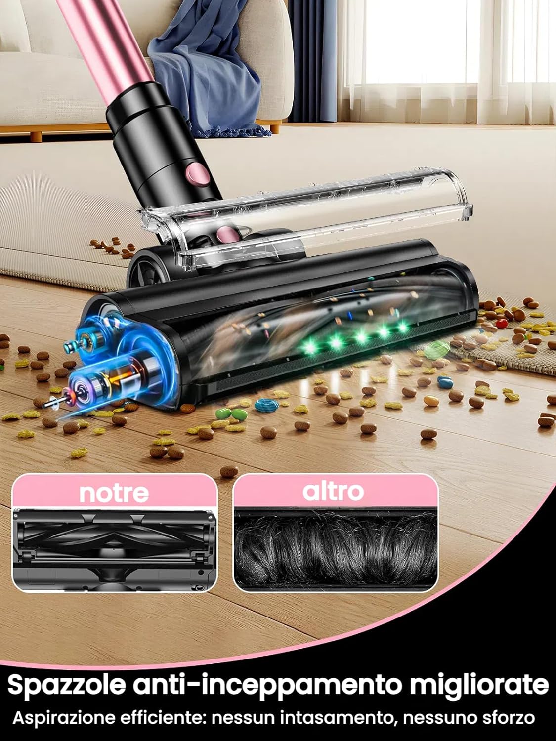 🌪️【Testina Anti-Groviglio V-Shape e Illuminazione a LED Verde】 Progettata per eliminare i nodi di peli, la testina V-shape con movimento laterale 180° e verticale 90° assorbe capelli e pelucchi su tappeti o mobili imbottiti. La luce LED verde integrata evidenzia polvere e peli nascosti sotto i mobili, raggiungendo angoli difficili come gambe di tavoli e pareti. Ideale per famiglie con animali domestici, previene allergeni e nodi senza sforzo.