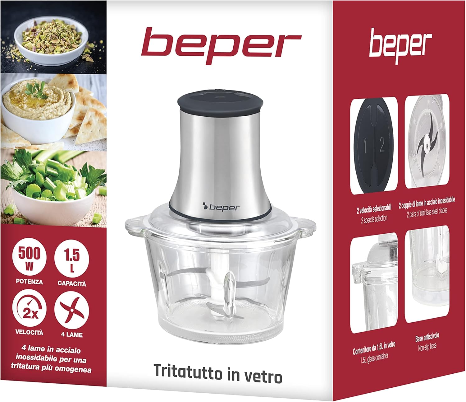 GLASS GRINDER – The glass container makes the BEPER chopper elegant and perfectly fit in your kitchen; with the double pair of stainless steel blades allows you to chop fruits, vegetables, meat, nuts, gravy, and even baby food in seconds