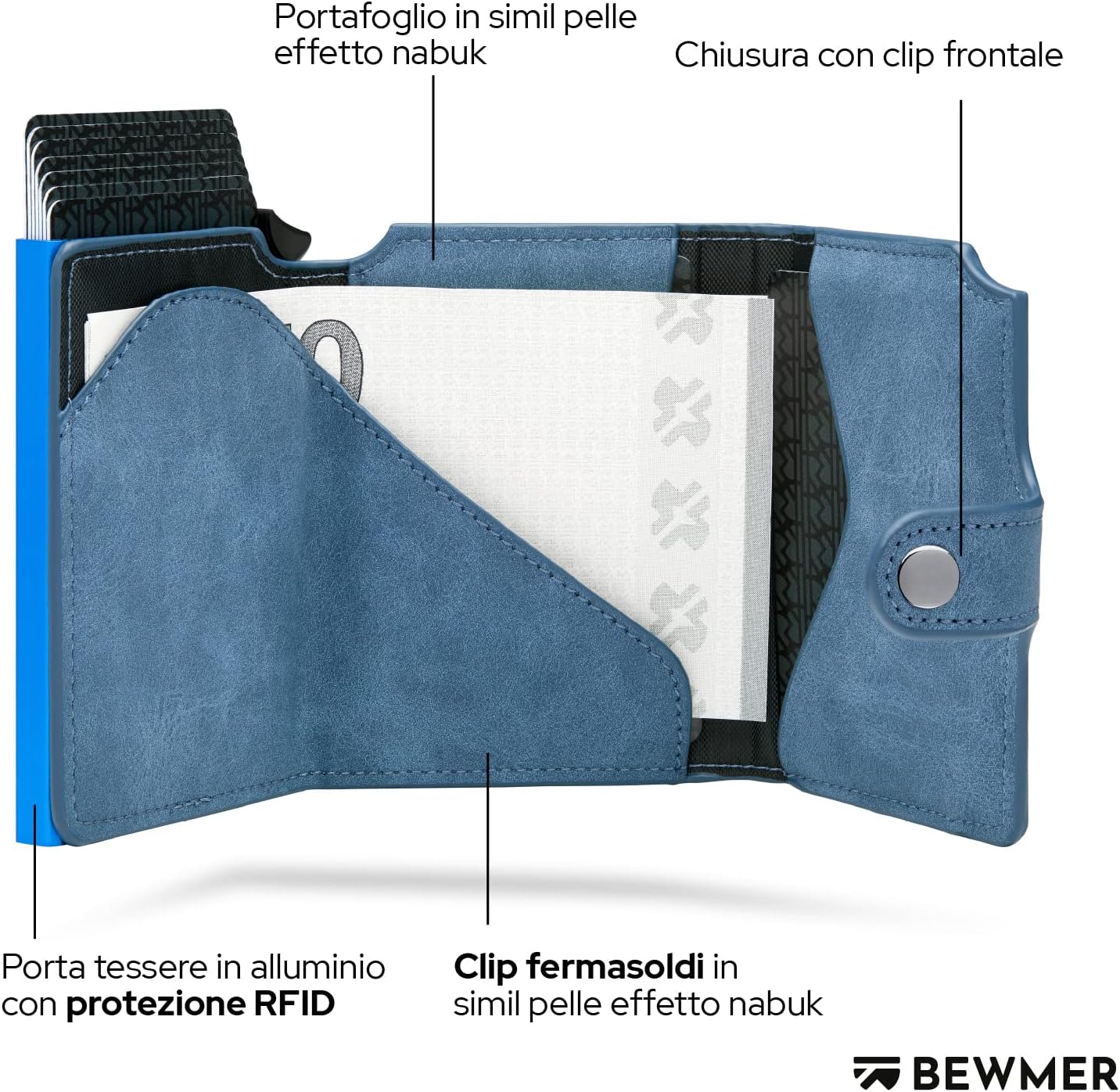 [SICUREZZA] Grazie alla tecnologia RFID / NFC integrata, questo accessorio funziona come un porta carte di credito uomo sicuro e schermato. La leva del sistema automatico evita che le carte escano accidentalmente dal portafoglio.