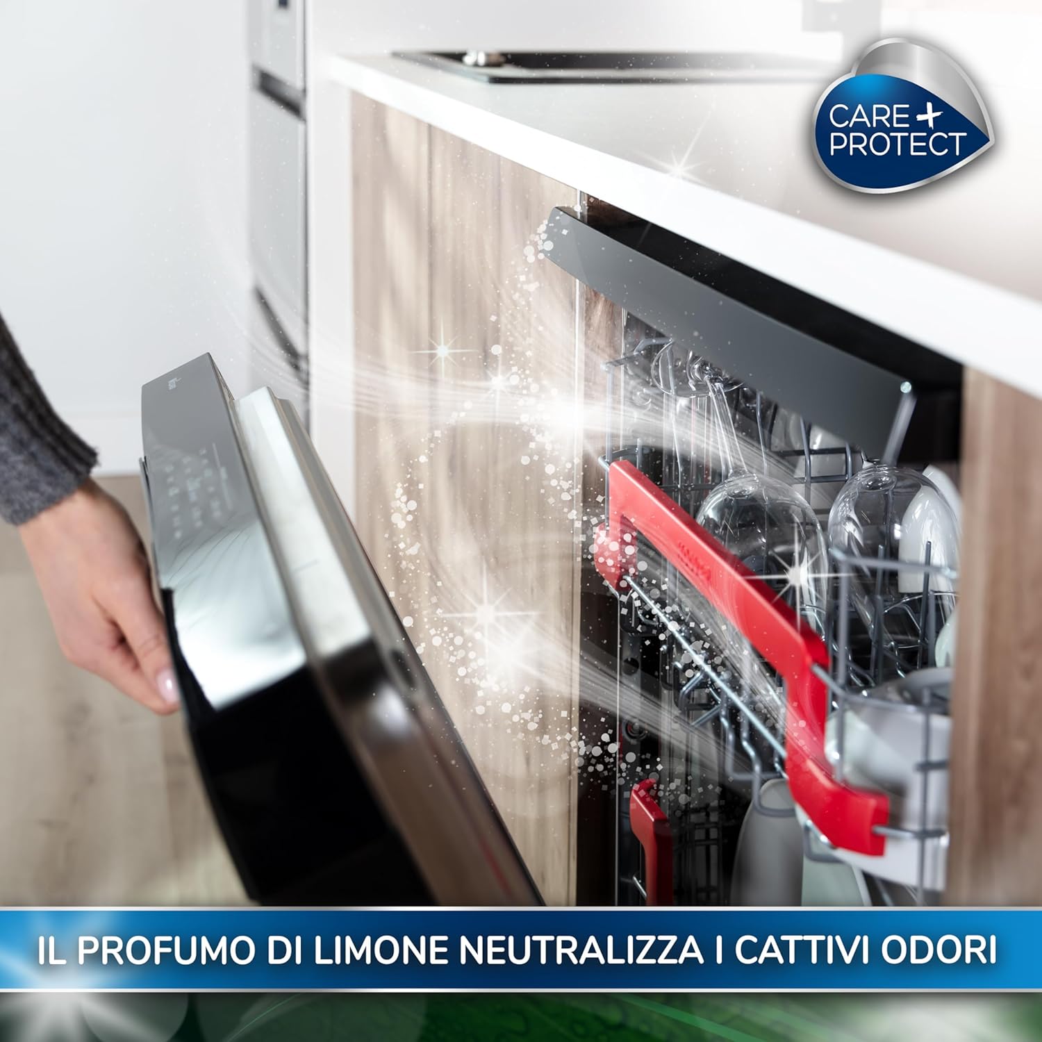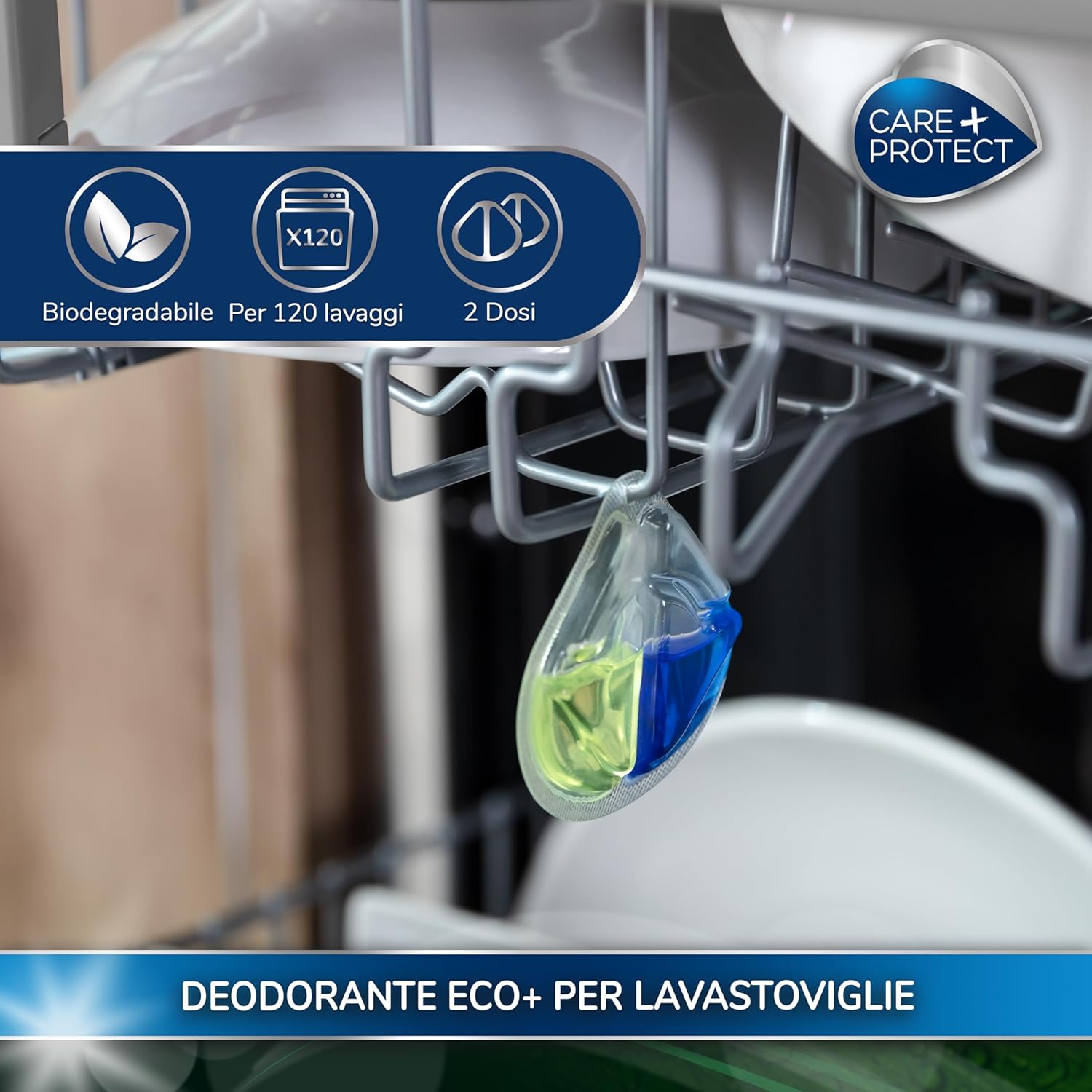 CARE+PROTECT Pack 3 ECO+ Dishwasher Deodorant, Eliminates Bad Odours, Long-Lasting Lemon Fragrance, 2 Shells, Up to 120 Washes.