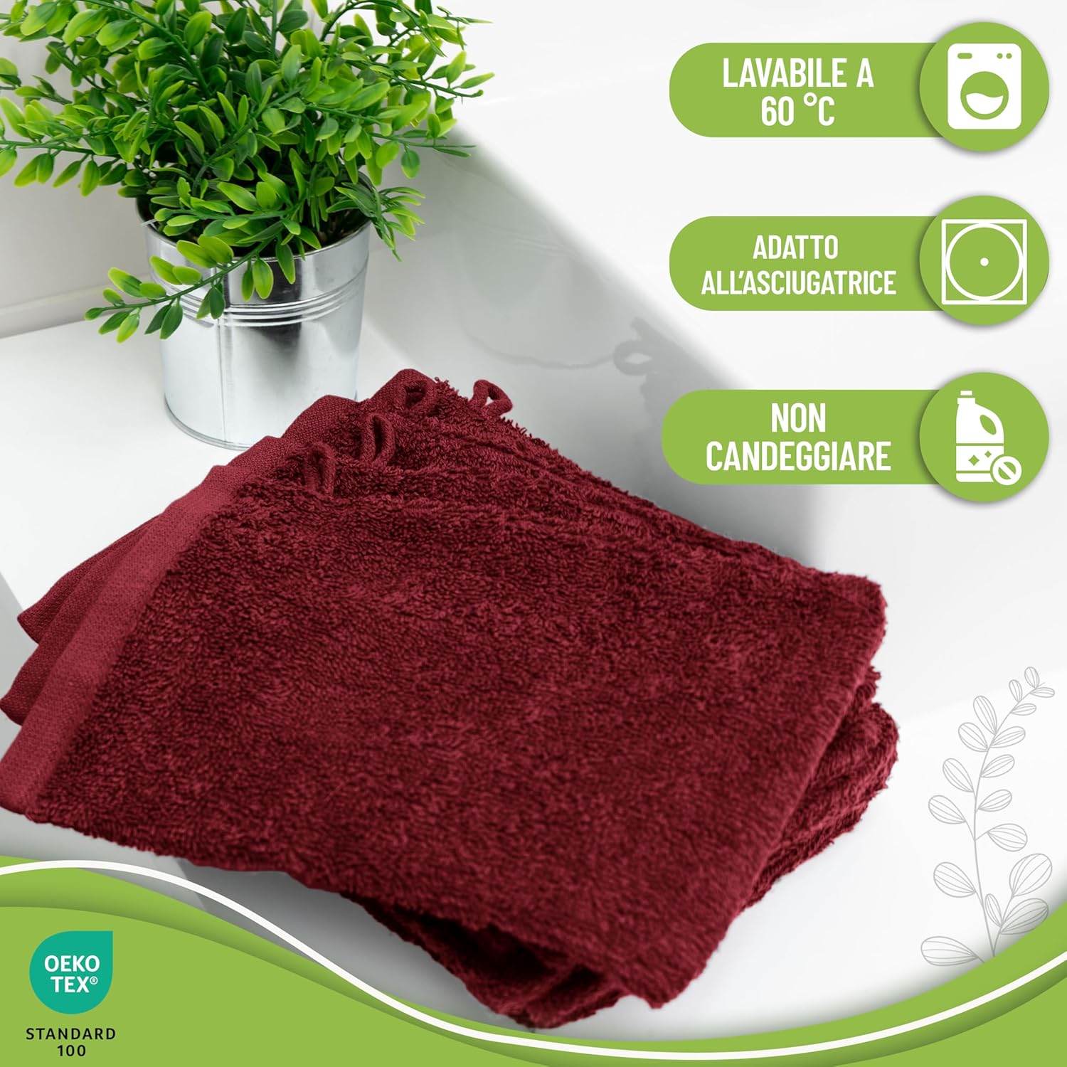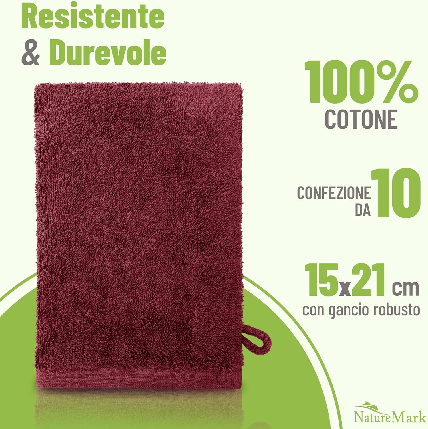Practical pack of 10 terry bath gloves with hanging loop – versatile and complete set, perfect for the whole family. Ideal for everyday use, guests or travel thanks to the ring for easy drying and repositioning.