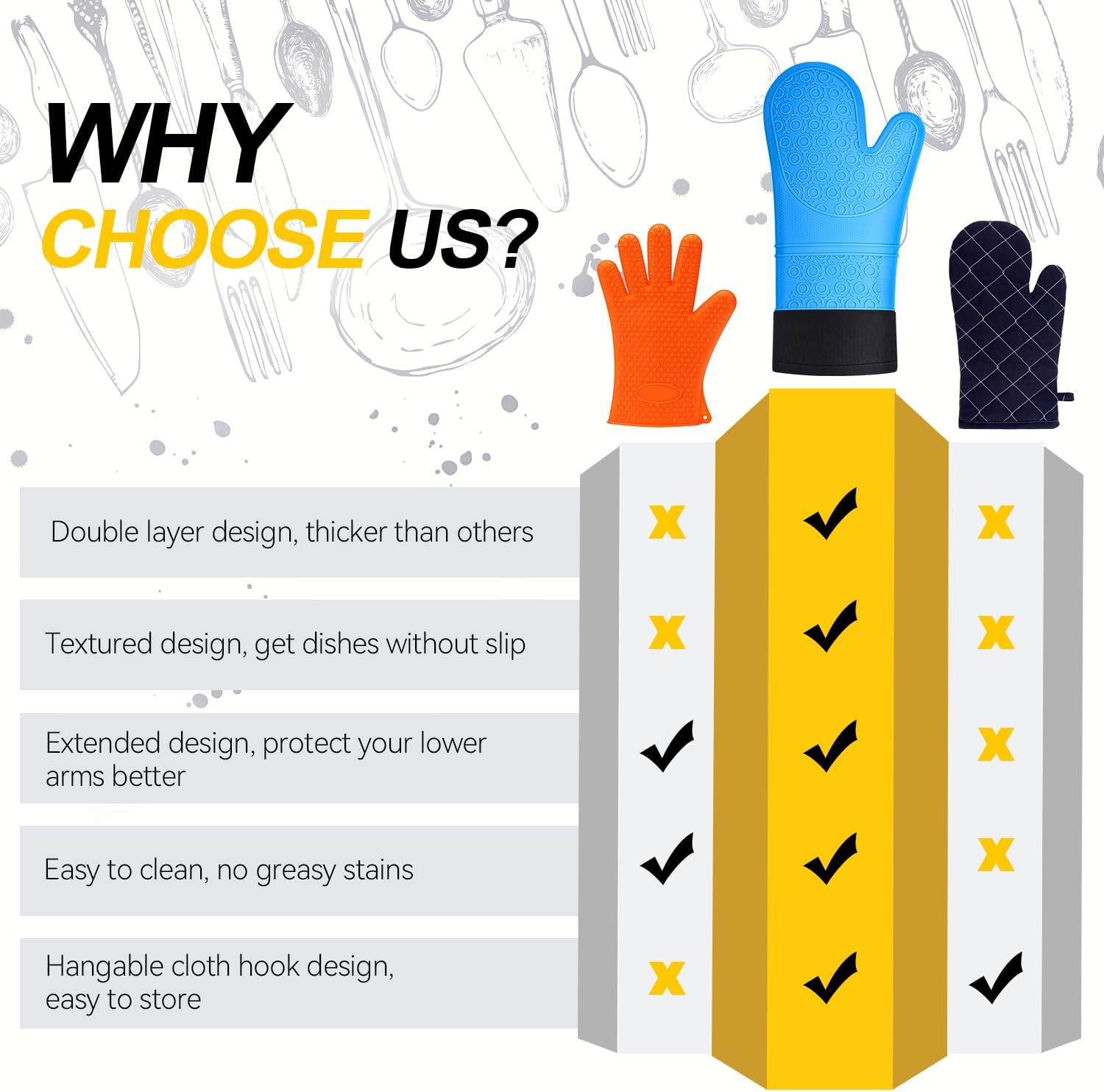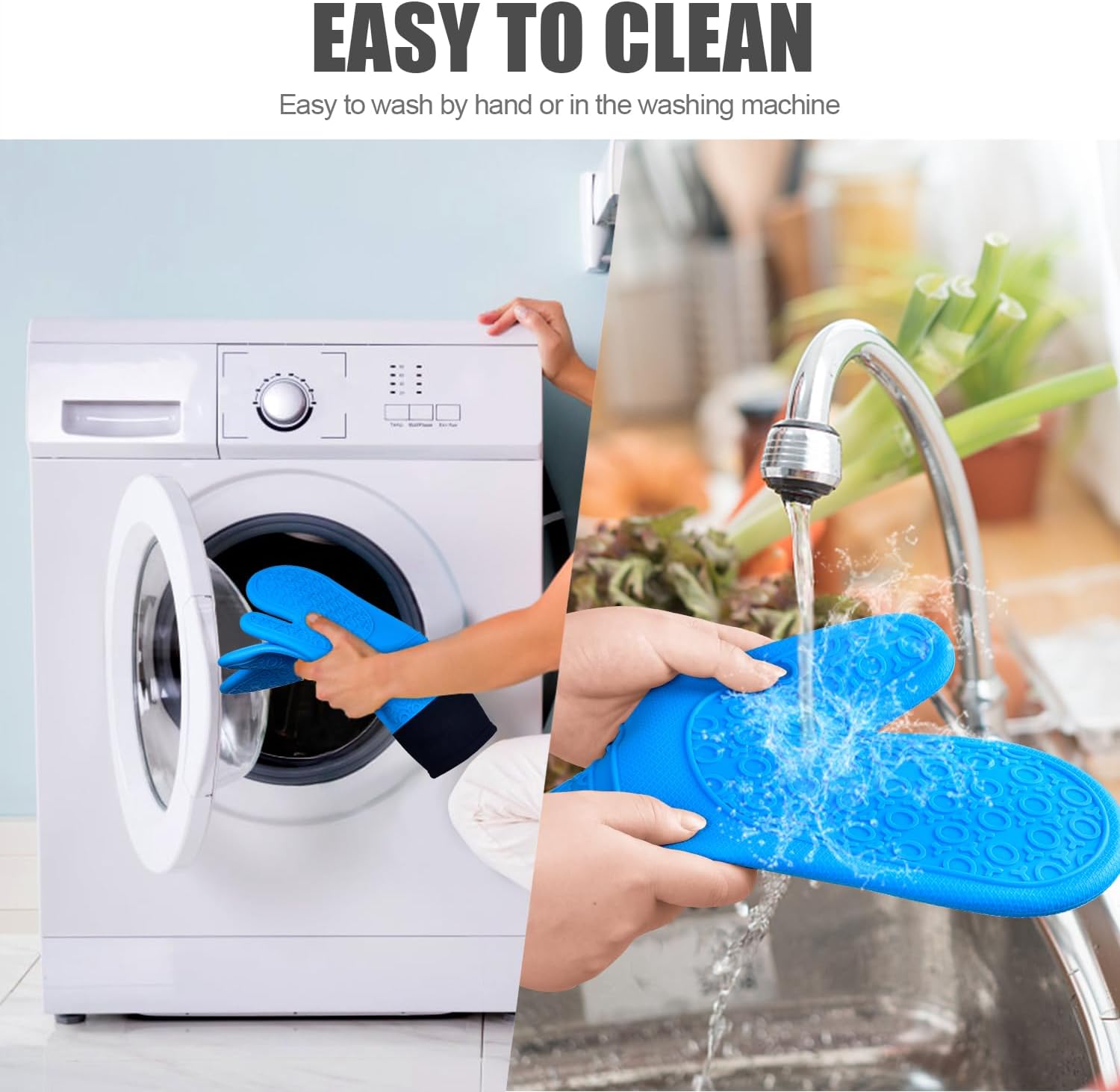 NON-SLIP & WATERPROOF:The rubber kitchen gloves are designed with textured surfaces that provide excellent grip for holding heavy trays, pots and utensils. They are waterproof and grease resistant Silicone oven gloves.
