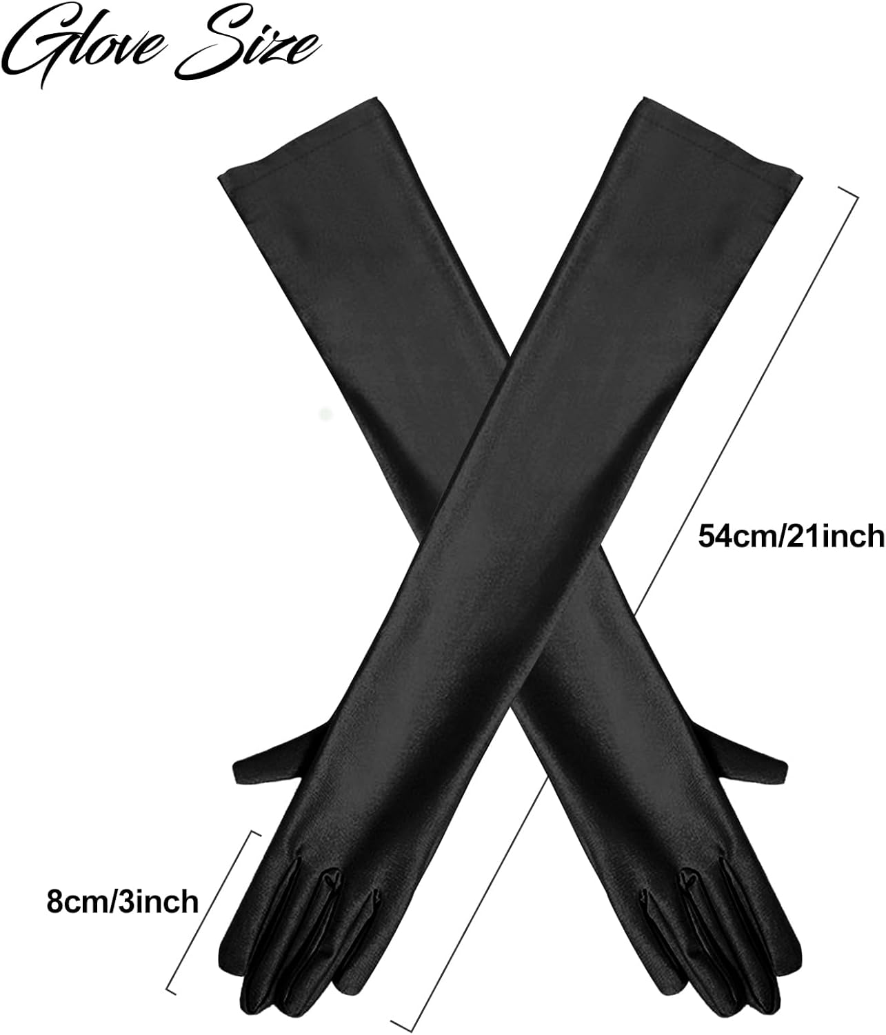 1. I guanti da opera sono lunghi 54 cm e si adattano alle mani della maggior parte degli adulti. I guanti sono elastici.