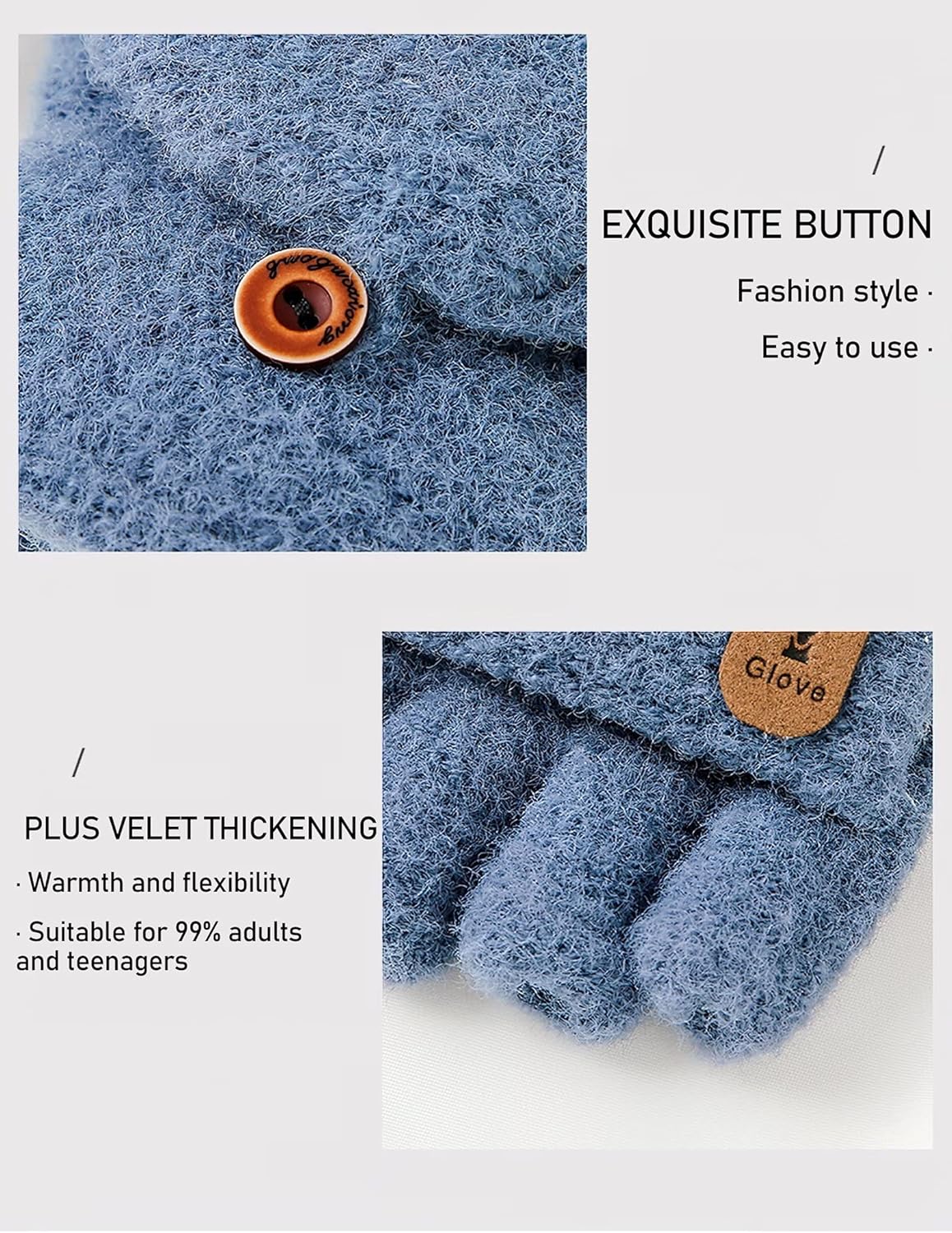 Quando hai bisogno di usare il tuo cellulare o prendere cose dalla borsa, puoi facilmente esporre le dita e operare come preferisci.C’è un bottone sul retro del guanto. Quando hai bisogno di usare spesso le dita, puoi piegare e allacciare il guanto.