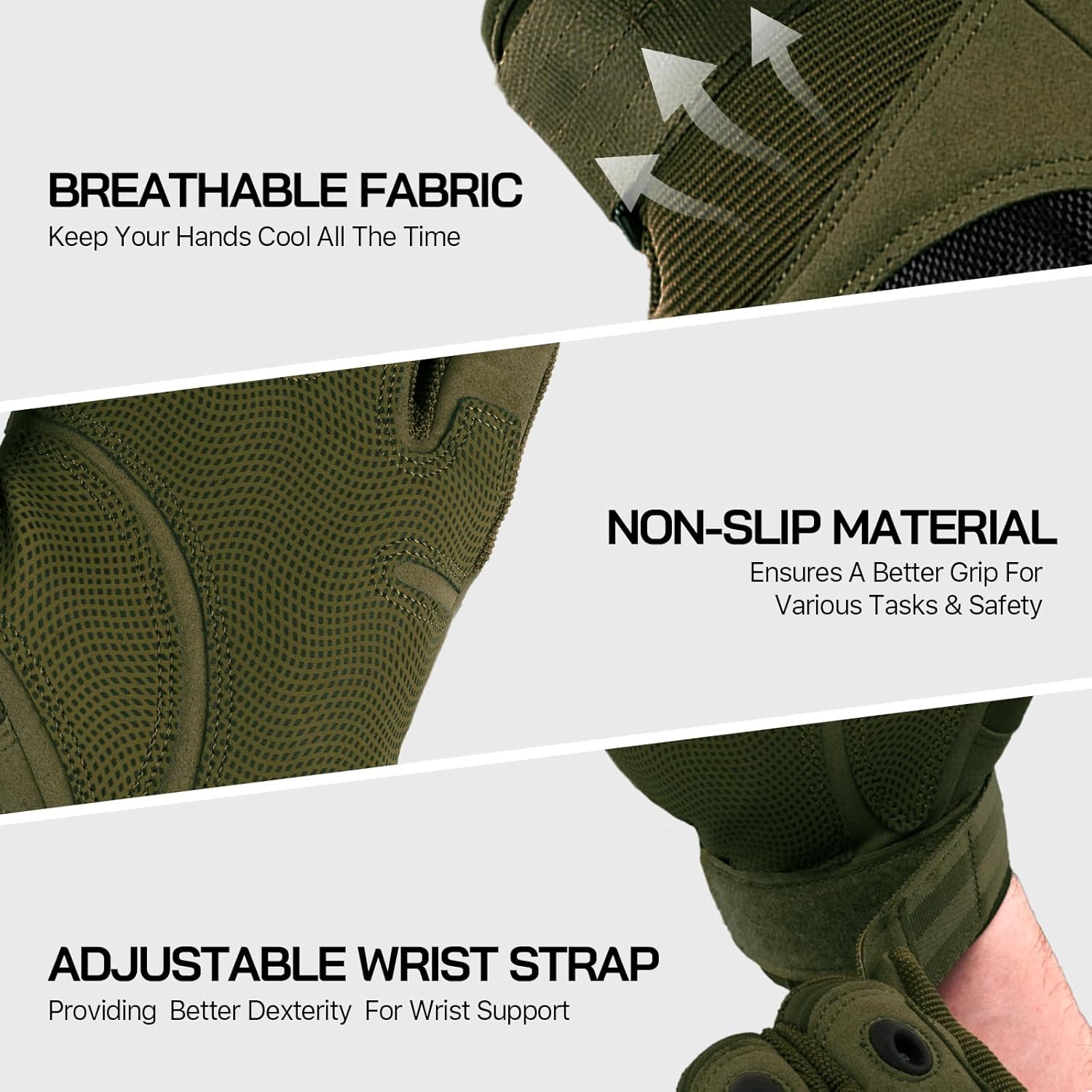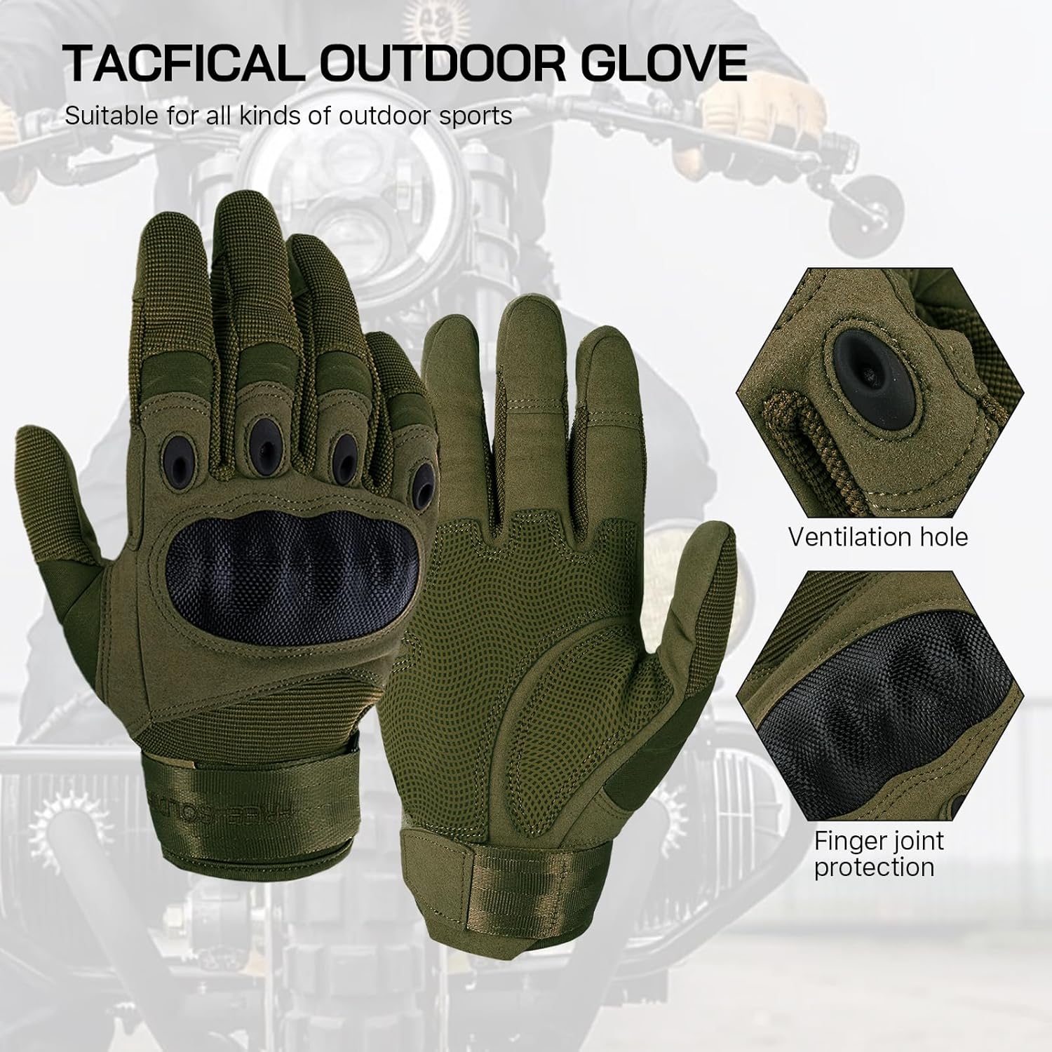 Freesoldier Outdoor Tactical Gloves, 100% Assured QualityIntroduction:1.Polycarbonate material, in accordance with the principles of ergonomic design, comfortable, with full protection.2.Embossed suede technology and palm chamois, non-slip, no smell.3. There are four on the fingers.Fashion design.The holes not only play a decorative role, but also serve for waterproof and aerate moisture.4.The front of the thumb is made of comfortable absorbent material, so that you can dry sweat during training.Ideal gloves for driving, motorcycle gloves, hunting gloves, protective gloves.Size Chart:S:Palm width 8cm, palm circumference 7.1-7.9M:Palm width 8.5cm, palm circumference 20-23cm.L:Palm width 9cm, palm circumference 23-25cm.XL:Palm width 9.5cm, palm circumference 25-28cm.XXL:Palm width 10cm, palm circumference 28-30cmNote:0.4-11.0 .2 in of the Manual measurement toleranceYour satisfaction is our constant purpose