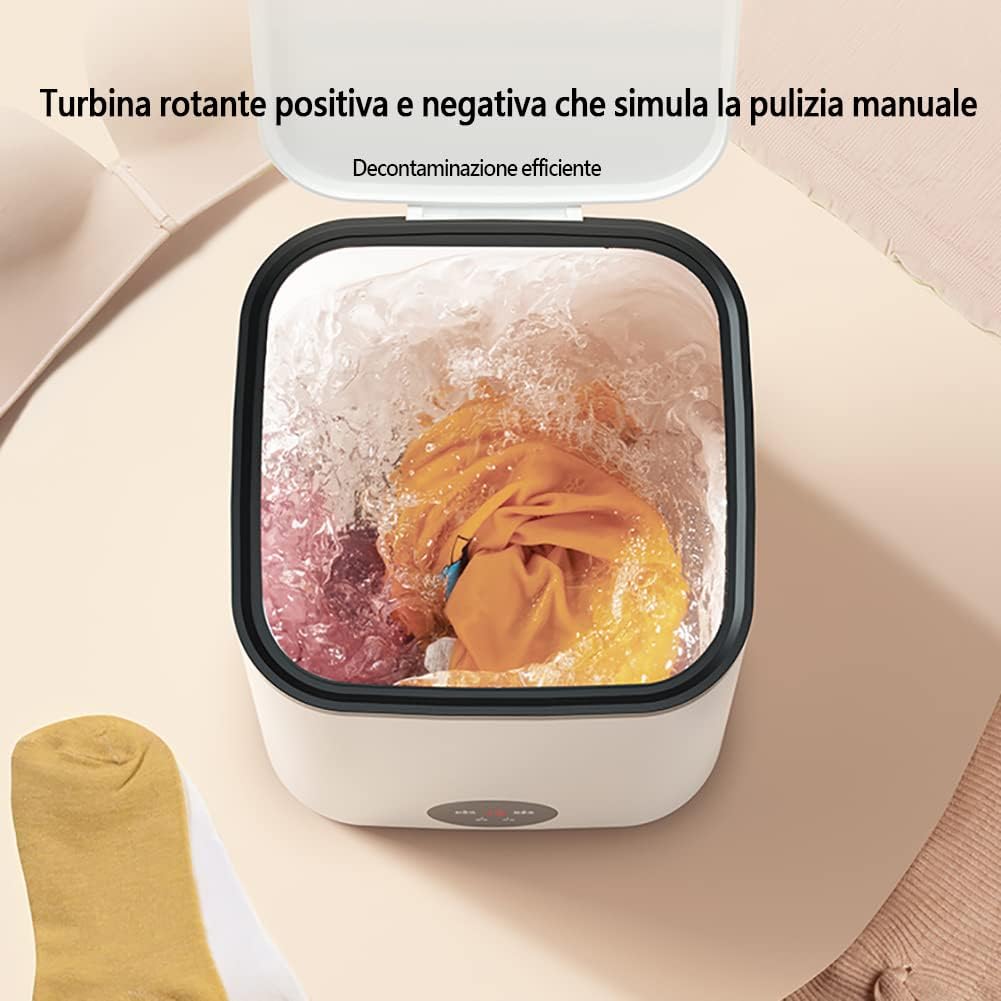 Design compatto, facile da trasportare e conservare, ideale per campeggio, appartamento, dormitorio, auto per il tempo libero e viaggi d’affari! Mini lavatrice può prevenire contaminazioni incrociate. Calze, vestiti per bambini e biancheria intima vengono puliti separatamente, il che è sia igienico che sano
