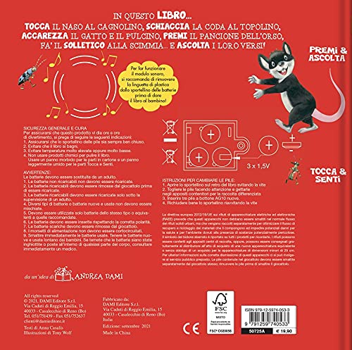 Fin dalla copertina, questo libro si presenta come un libro-gioco irresistibile: puoi toccare il naso del cagnolino, sentirne la morbidezza e ascoltare il suo bau bau se lo premi. Nelle pagine interne, fai il solletico alla scimmietta, accarezza il gatto o il pulcino, gratta la pancia all’orso, tira la coda al topolino… e ascolta i loro versi! Età di lettura: da 3 anni.