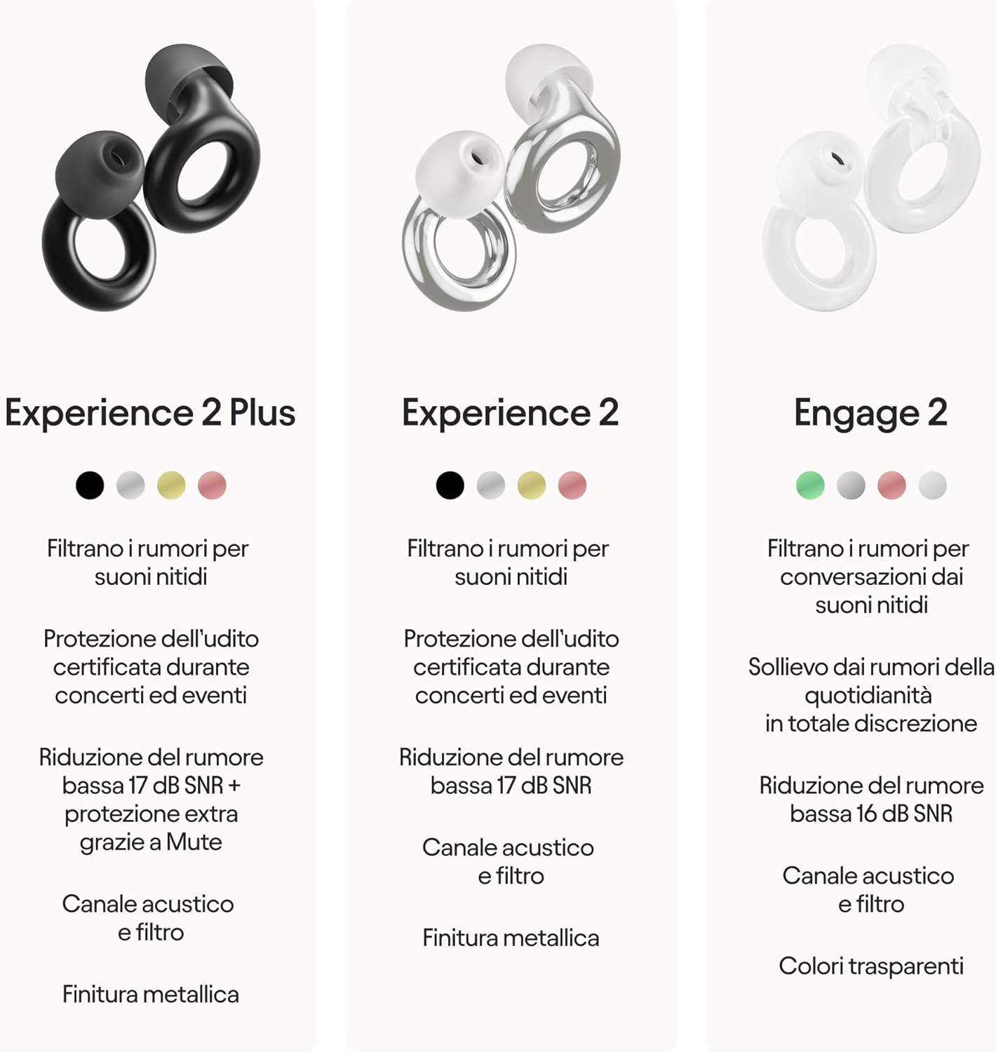 CERTIFIED HEARING PROTECTION: Loop Experience 2 ear plugs are certified hearing protection devices that offer shelter from the loudest noises to experience any situation with peace of mind, regardless of volume. This model offers a noise reduction of 17 dB SNR.