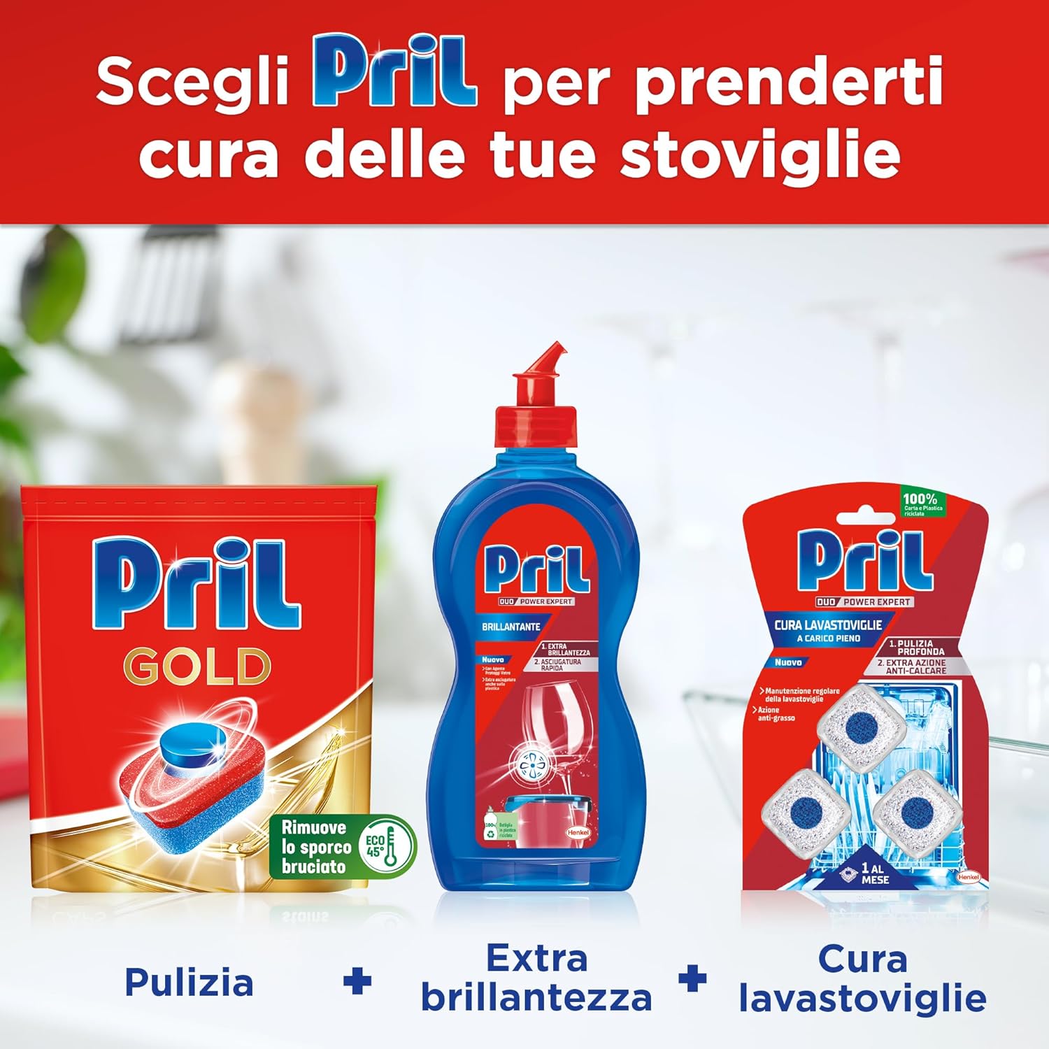 Il detersivo per lavastoviglie Pril Gold Tabs offre 10 azioni tra cui brillantezza, anti-odore, anti macchie d’acqua ed extra potere contro lo sporco bruciato.