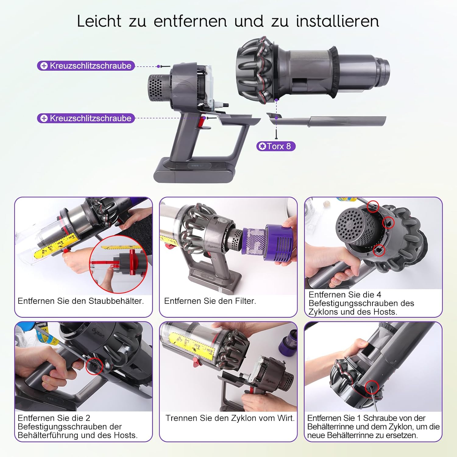 HIGH QUALITY CYCLONE V10 PARTS – Our cyclone V10 replacement parts are made of high quality raw materials, good quality with high workmanship, can withstand repeated slipping and impact. Fully restore the function of cyclone sound wall, automatically solve the problems of dust bucket falling and the non-opening of the dust bucket cover.