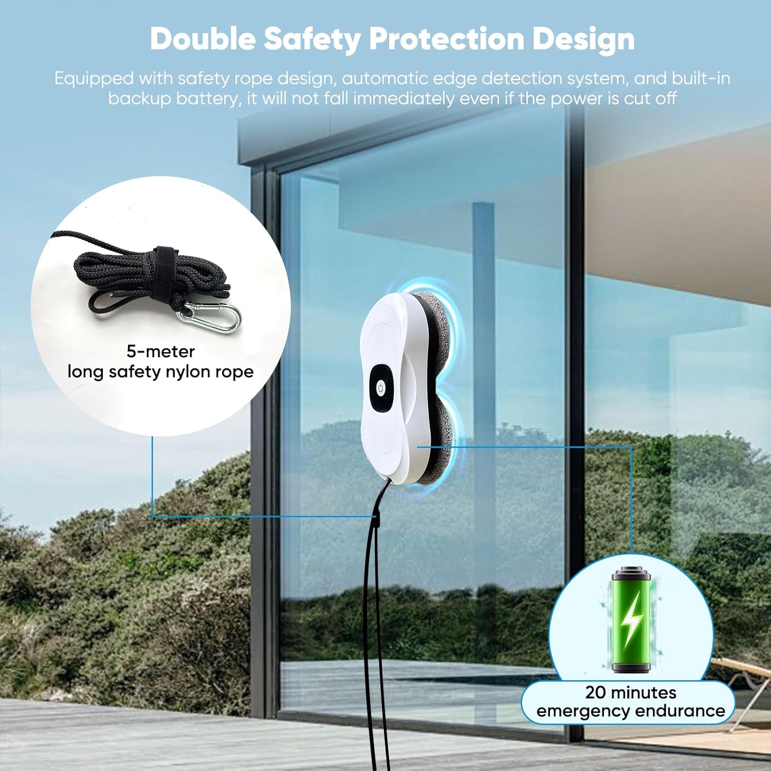 【Multiple Security Protection】Built-in UPS backup battery. In the event of an unexpected power outage, the glass washer robot can stay firmly attached to the window for up to 20 minutes. The automatic squeegee robot is equipped with a 5.2m power cord and a 5m reinforced safety rope, made of climbing materials to prevent accidental falls. Intelligent detection of obstacles and edges for smooth cleaning. The multiple protection of the robot window glazing ensures safety when cleaning windows on high floors.