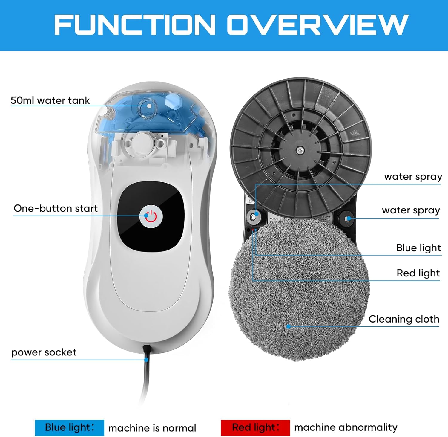 【Powerful 2800Pa Suction】With a powerful suction power of 2800Pa, the glass robot can firmly adhere to the window at all times. (Note: Excessively wet fiber mats can reduce suction power and cause slipping.) The robot window cleaner must be plugged into a power outlet during operation and the suction power is only effective when it is turned on. This automatic window cleaner is suitable for smooth vertical surfaces such as glass, mirrors, large tiles, marble countertops and more.
