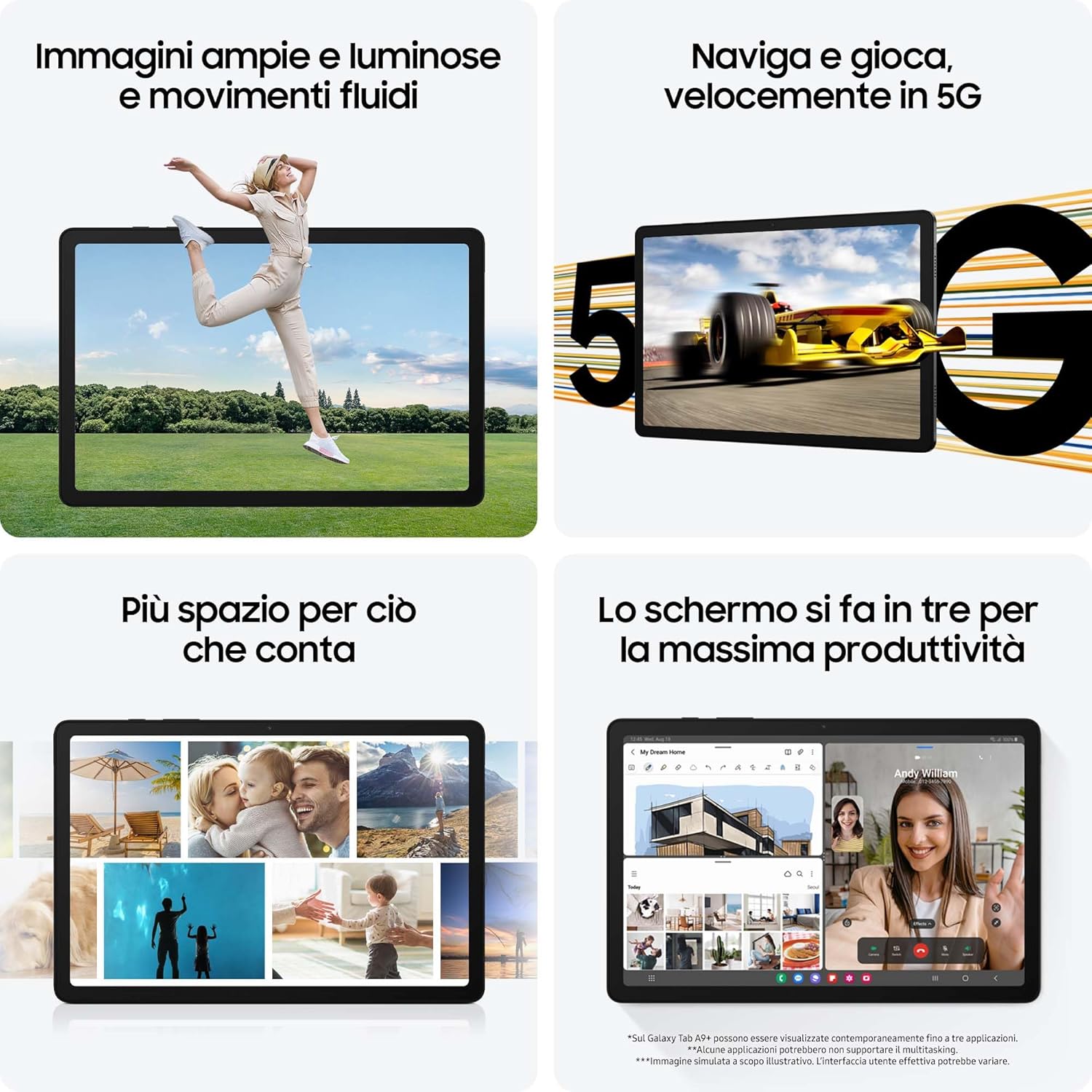 Conserva tutto ciò che ami: il tablet Samsung Galaxy Tab A9+ offre fino a 8GB di RAM per ottimizzare le prestazioni durante il multitasking e una capacità di archiviazione di 256 GB (ampliabile fino a 1TB); salva tutti i tuoi file in alta risoluzione, conserva di più ed elimina di meno³ ⁸ ⁹ ¹⁰ ¹¹