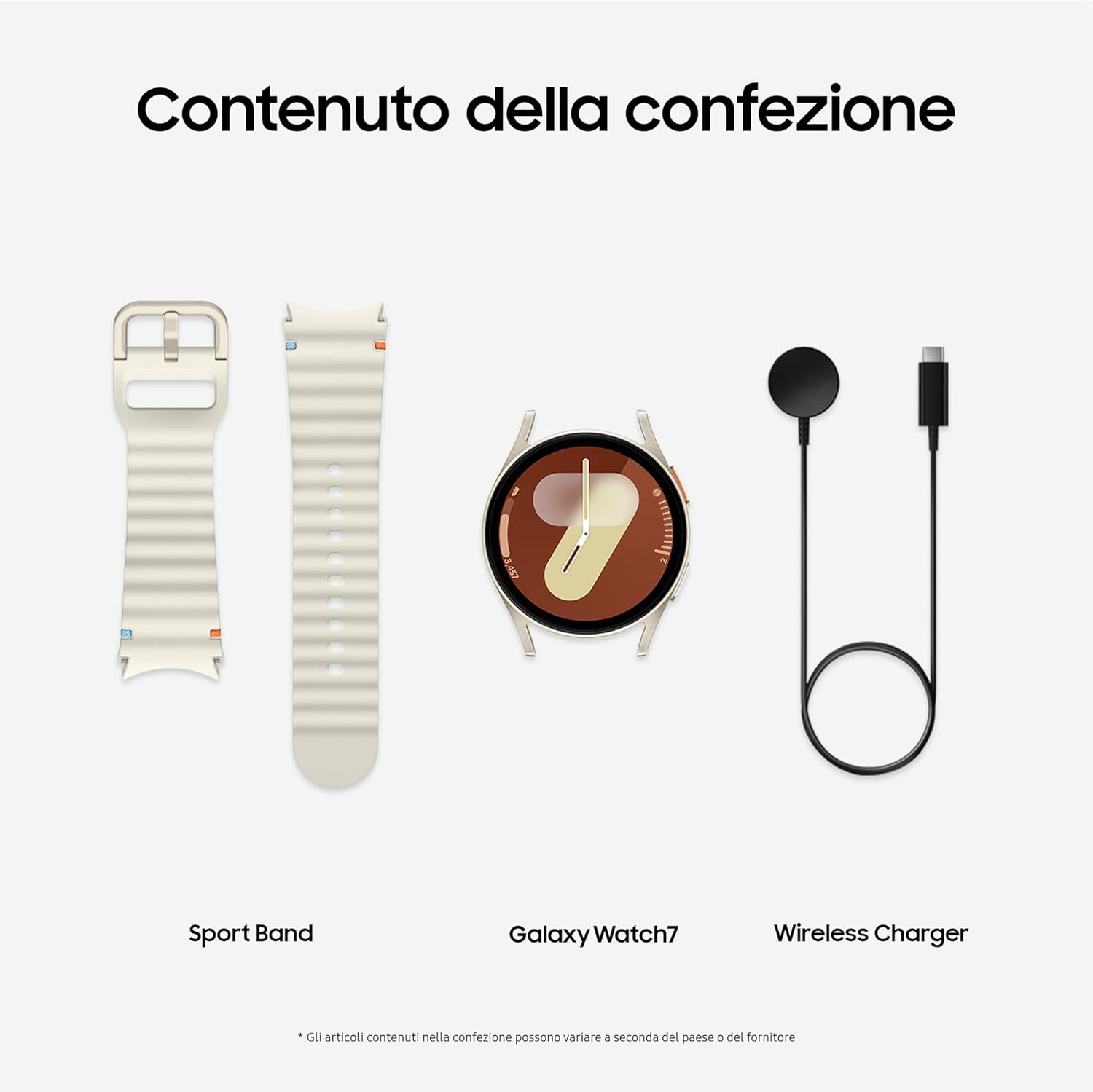 Contenuto: 1x Samsung Galaxy Watch7 Cream, caricabatterie (Micro USB) e manuale d’uso