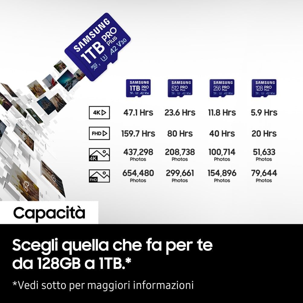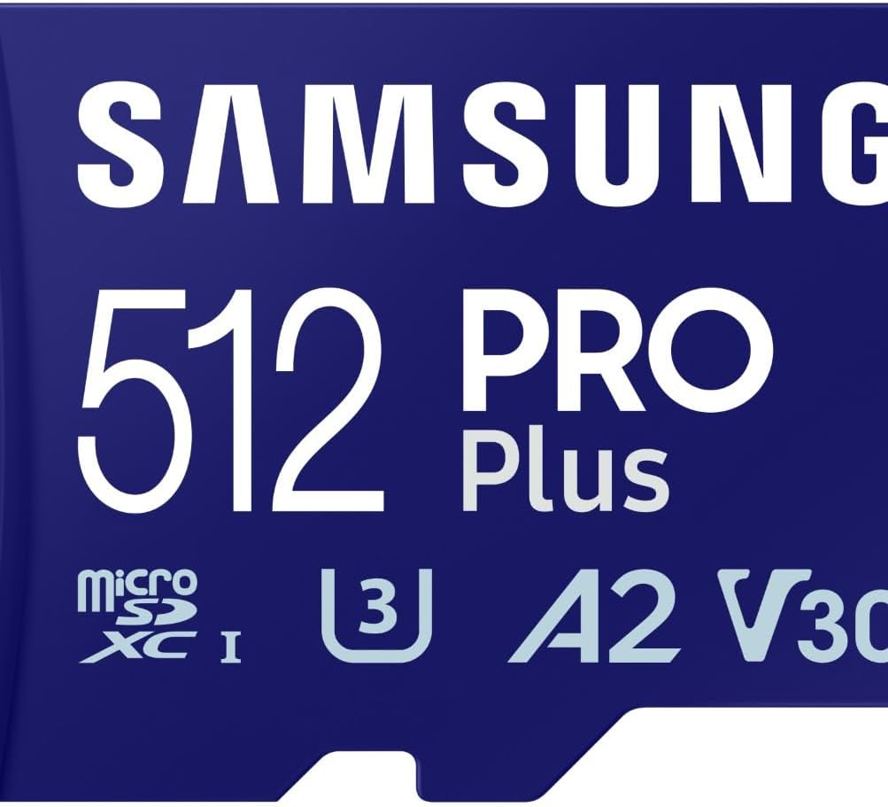 Contents: 1 x Samsung PRO Plus Memory Card MicroSD (MB-MD512SA), 512 GB, Dimensions: 15 x 11 x 1 mm, Weight: 0.3 g, Colour: Blue