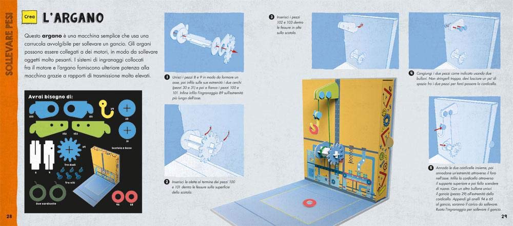 Cosa contiene: libro di 64 pagine pezzi in cartoncino già ritagliati e facili da assemblare dadi e viti elementi per creare un sistema idraulico cordicelle ed elastico