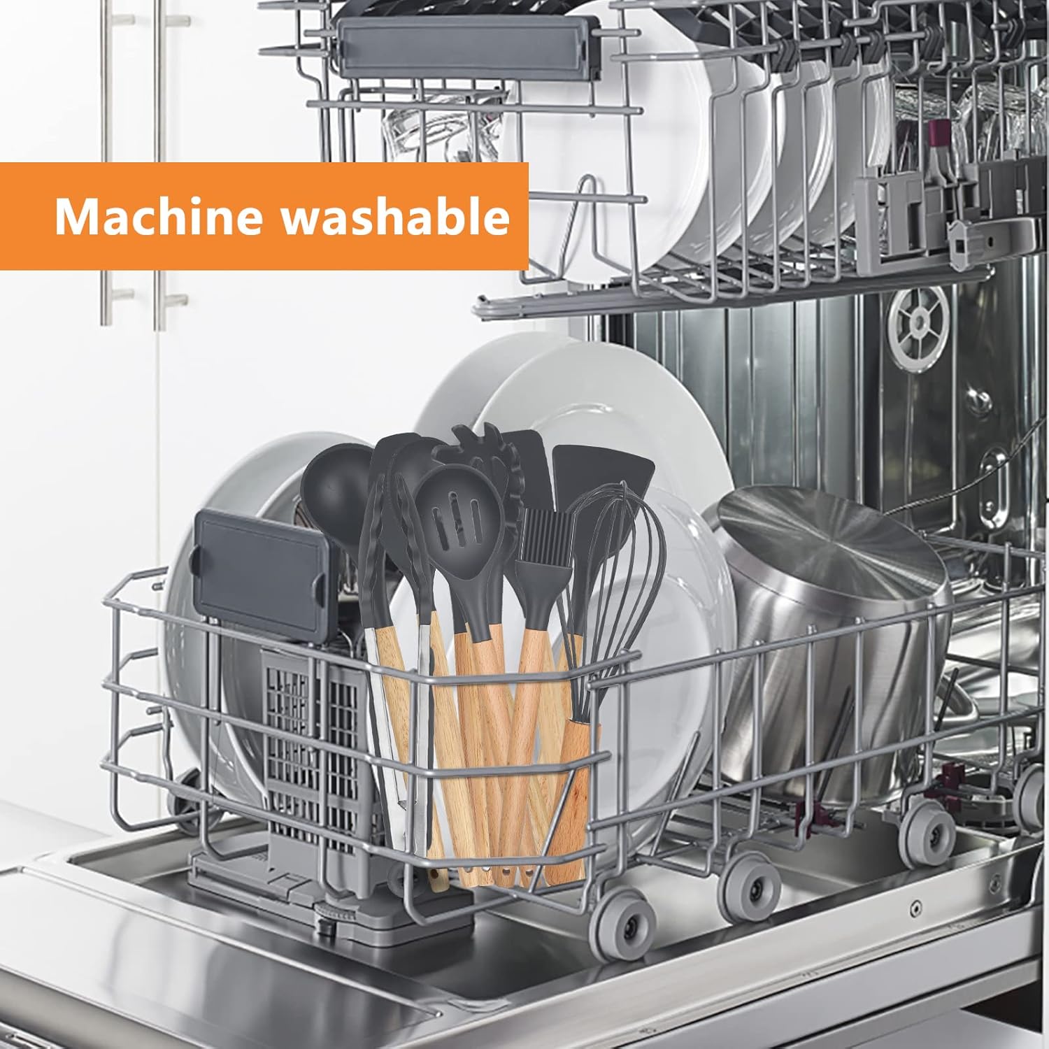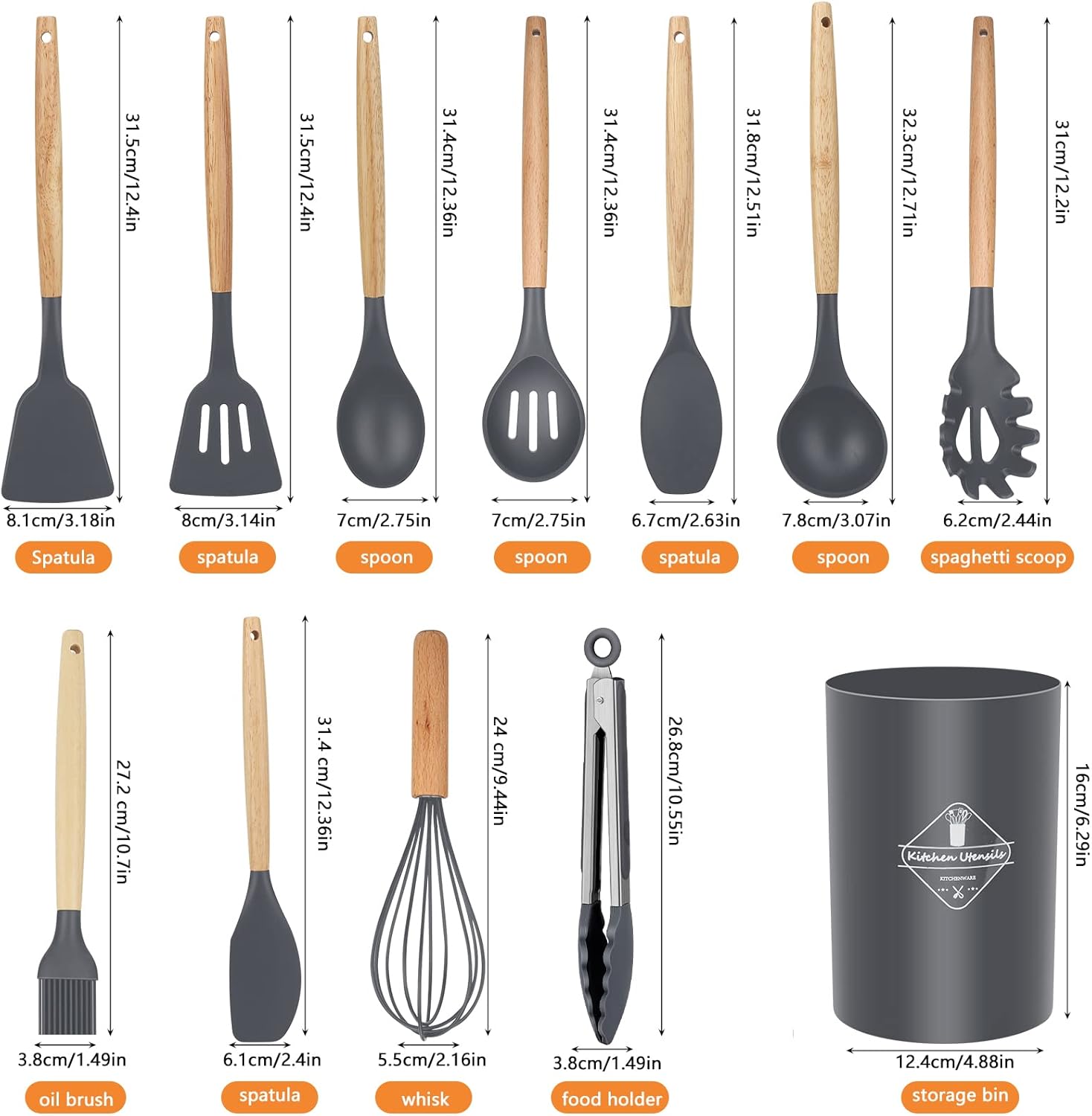 Utensili da Cucina Accessori, 12 PCS Set Mestoli Cucina, Utensili Cucina Antigraffio con Contenitore e Manico in Legno Senza BPA con Spatole/Spatola/Cucchiaio/Frusta/Pennello/Mestolo/Paletta