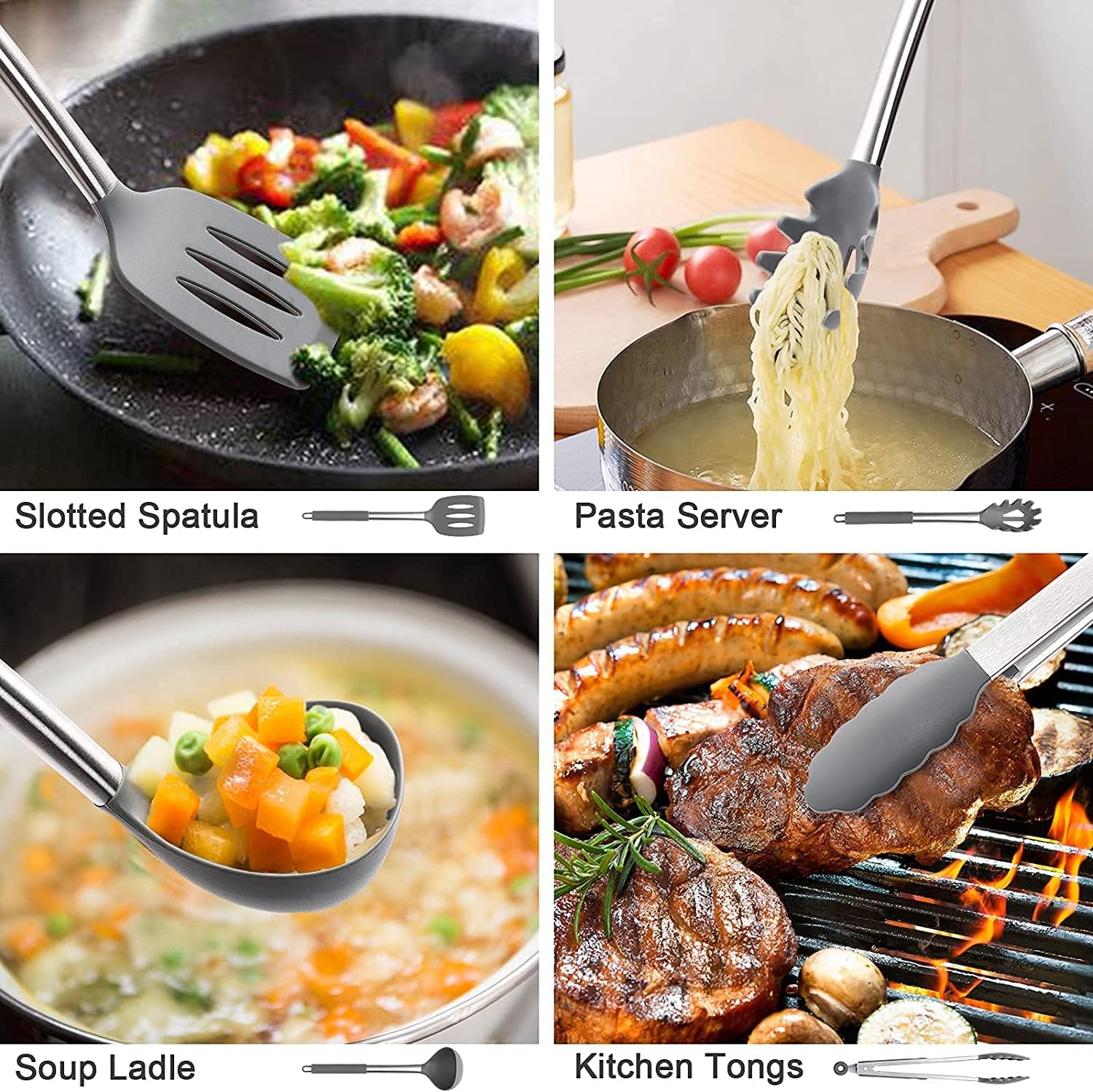 Il kit di utensili da cucina comprende grande spatola perforata, spatola, spatola cucchiaio, spatola flessibile, spatola scanalata, coltello da negozio, cucchiaio scanalato, schiumatoio, cucchiaio, strumento per la fornitura di spaghetti, pennello, morsetto da cucina, cucchiaio per zuppa, frusta, negozio di cucchiai, portautensili, cucchiaio per tazze, cucchiaio. Soddisfa le vostre varie esigenze di cucina e vi aiuta a preparare i migliori piatti di sempre.