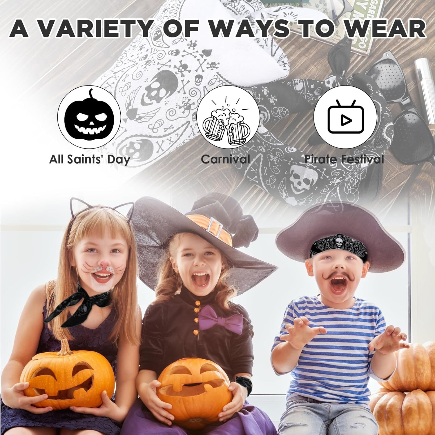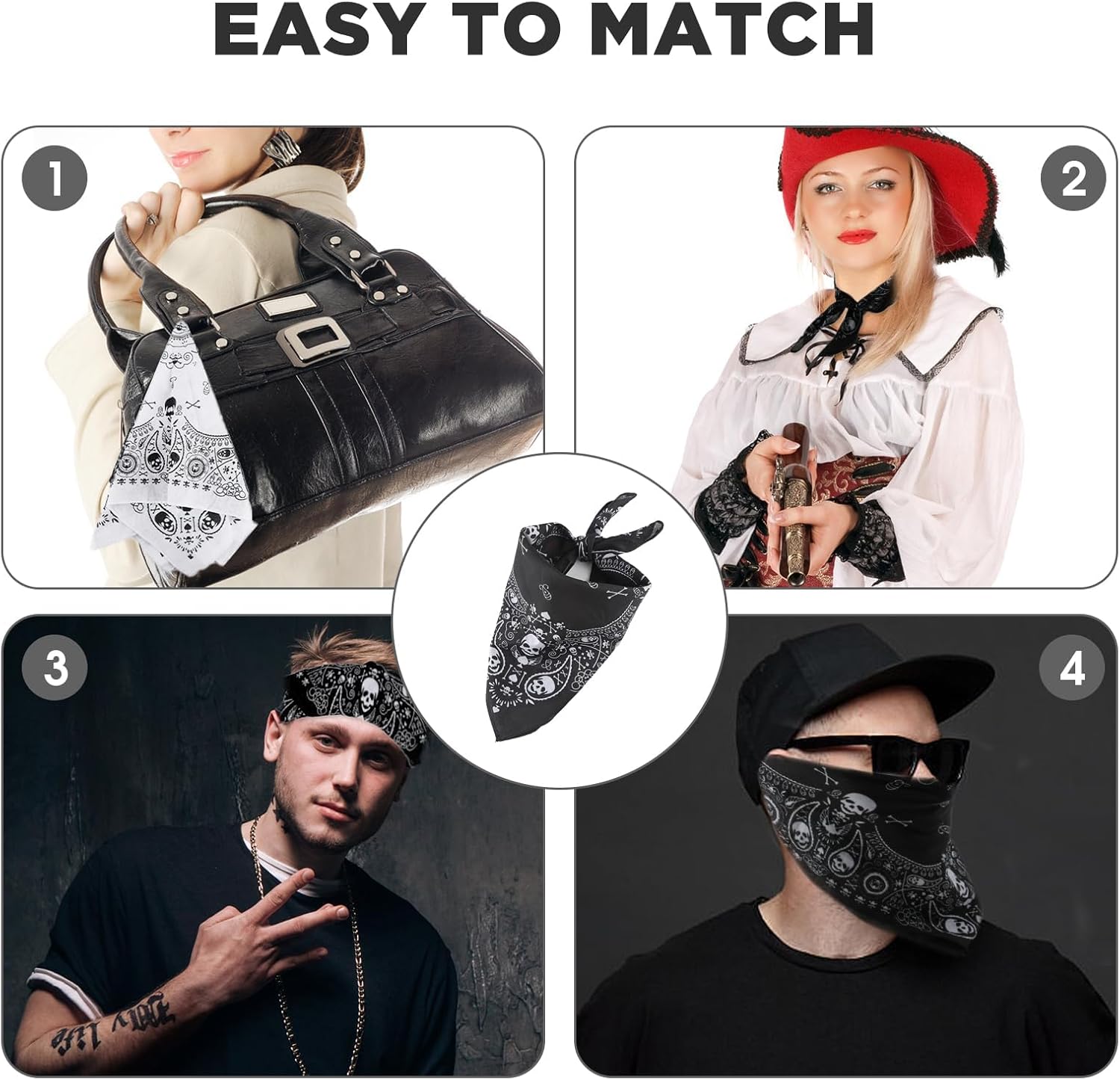 Bandana Pirata realizzate con un tessuto di cotone di alta qualità, le nostre bandane sono durevoli, elastiche e facili da mantenere. Sono perfette per uomini, donne e bambini e possono essere utilizzate in vari modi: come sciarpa, decorazione per borsa, fascia per capelli, bracciale, ecc.