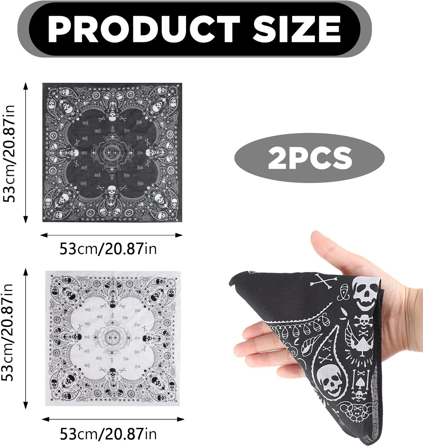 Scopri il nostro Set di 2 Bandane Nere Stampate con Teschio, perfetto per Halloween o come accessorio elegante per tutti i giorni. Ogni bandana misura circa 53 x 53 cm ed è realizzata in morbido cotone per un comfort ottimale.