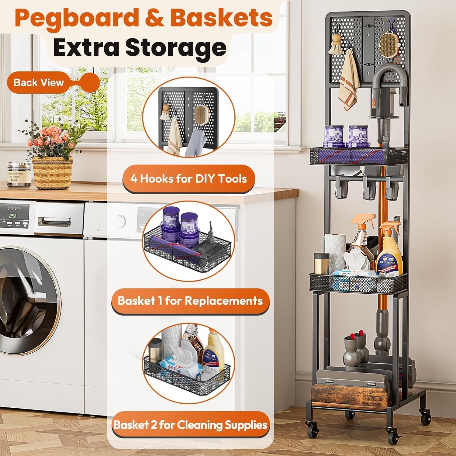 【Space-saving & Corner-Friendly Design】Compact and slim, this vacuum cleaner organizer fits perfectly in corners or tight spaces, making the most of unused space in the living room, laundry room, kitchen or garage.
