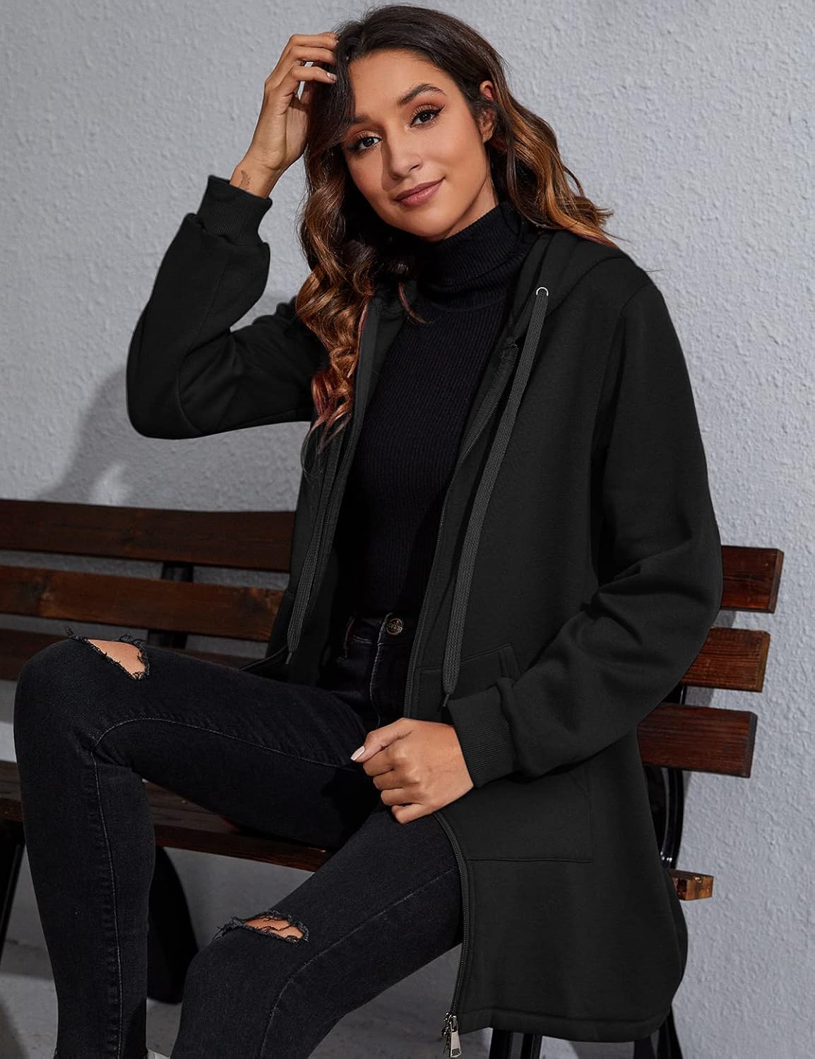 Un cappotto giacca caratterizzato da design a zip intera, vestibilità silm, con cappuccio, maniche lunghe con polsini a coste, vestibilità lunga e tasche sui lati che ti tengono al caldo in autunno o inverno freddo.